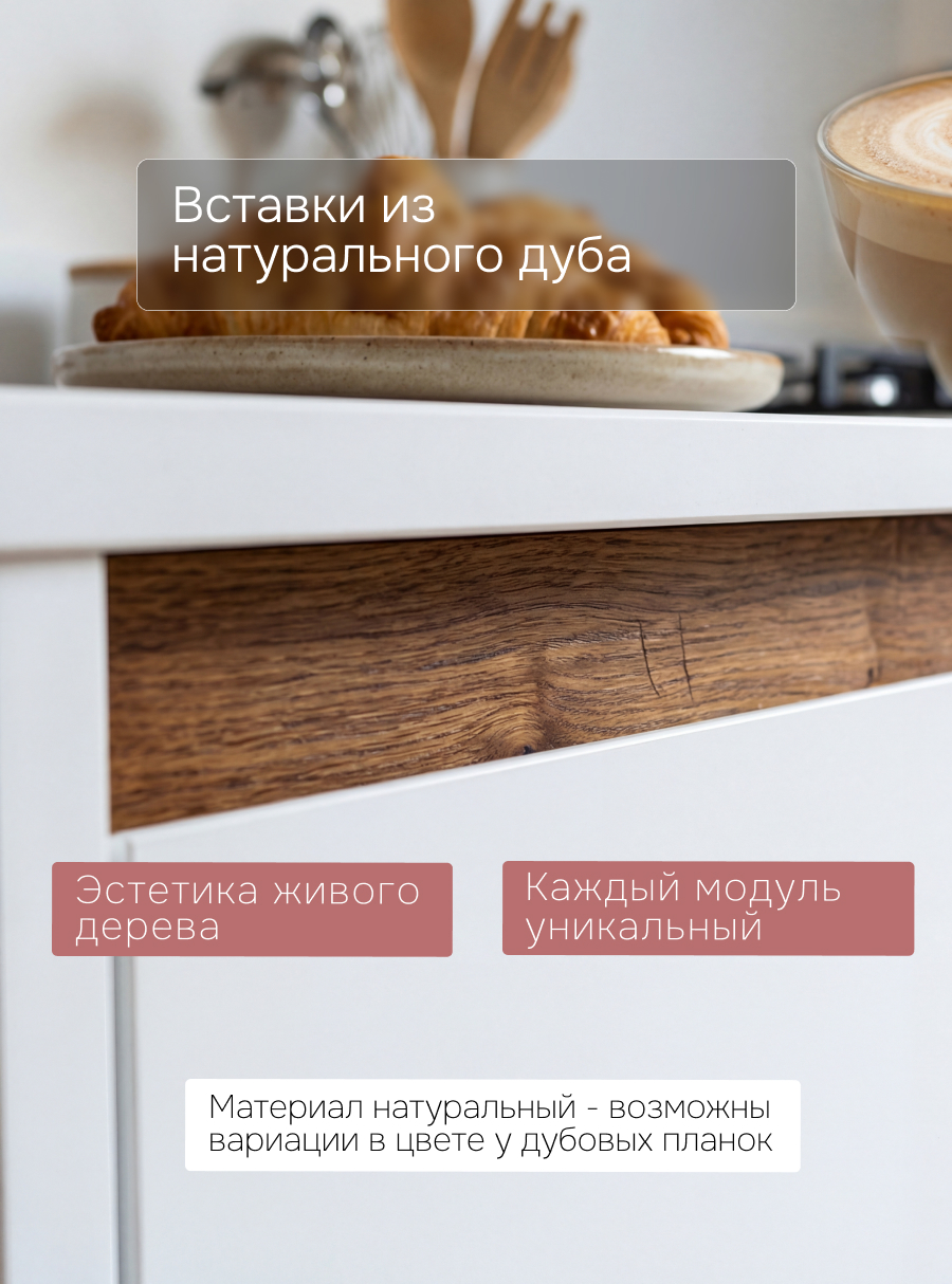 Универсальный напольный кухонный модуль в современном стиле отличается лаконичным дизайном со скрытыми ручками и декоративными вставками из массива дуба, что придает уникальность каждому элементу мебели.