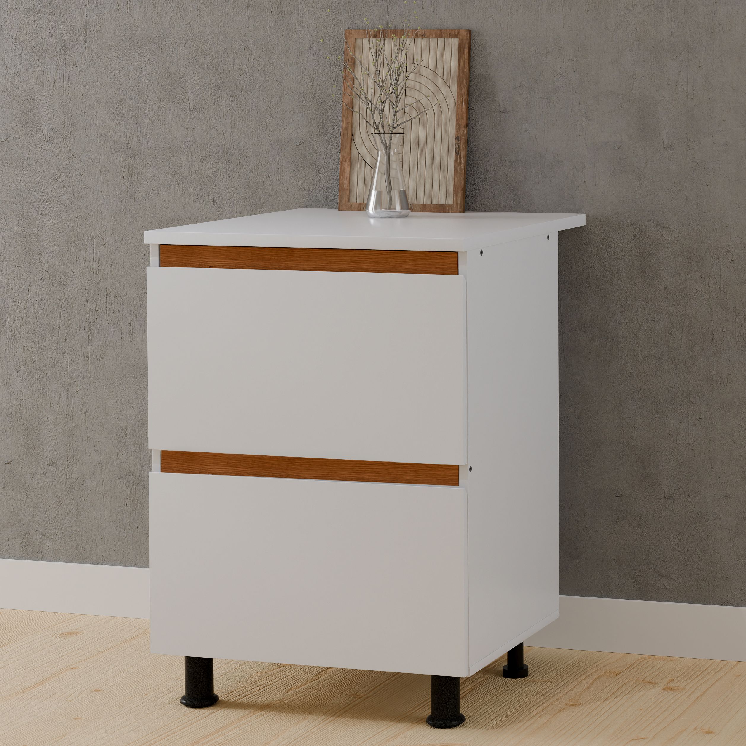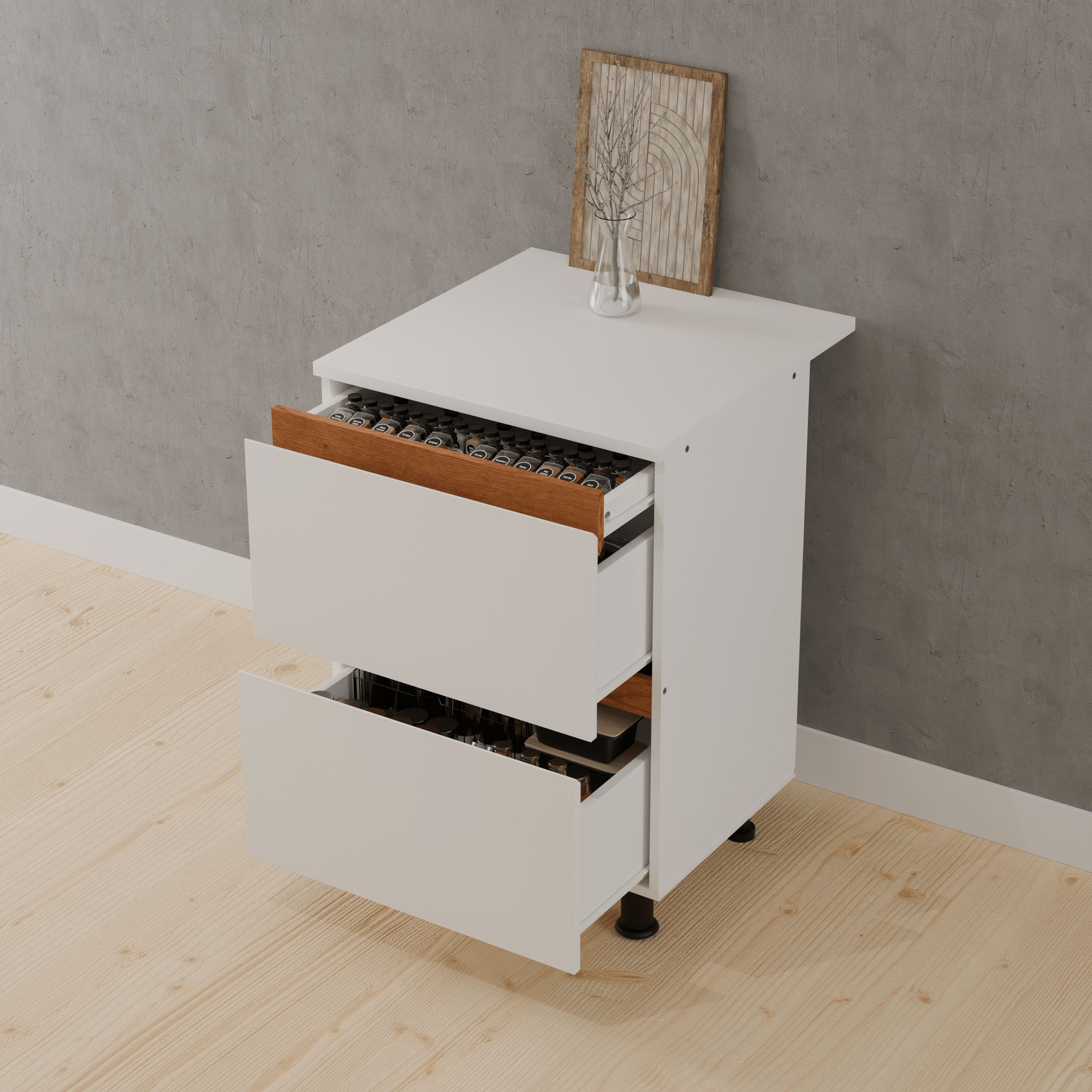 Тумба на кухню изготовлена из качественного ламинированного ДСП (ЛДСП) и дополнена декоративными вставками из массива дуба, что обеспечивает долговечность и привлекательный внешний вид. При изготовлении шкафа использовалось только безопасное для человека ЛДСП в соответствии с европейскими нормами классов содержания формальдегида (не более 10 мг на 100 г). Имеет нежный белый цвет, поэтому мебель всегда будет придавать комнате приятный и светлый внешний вид. Задняя стенка и дно ящиков выполнены из белого ДВП с целью облегчения конструкции, делая её более привлекательной и долговечной.