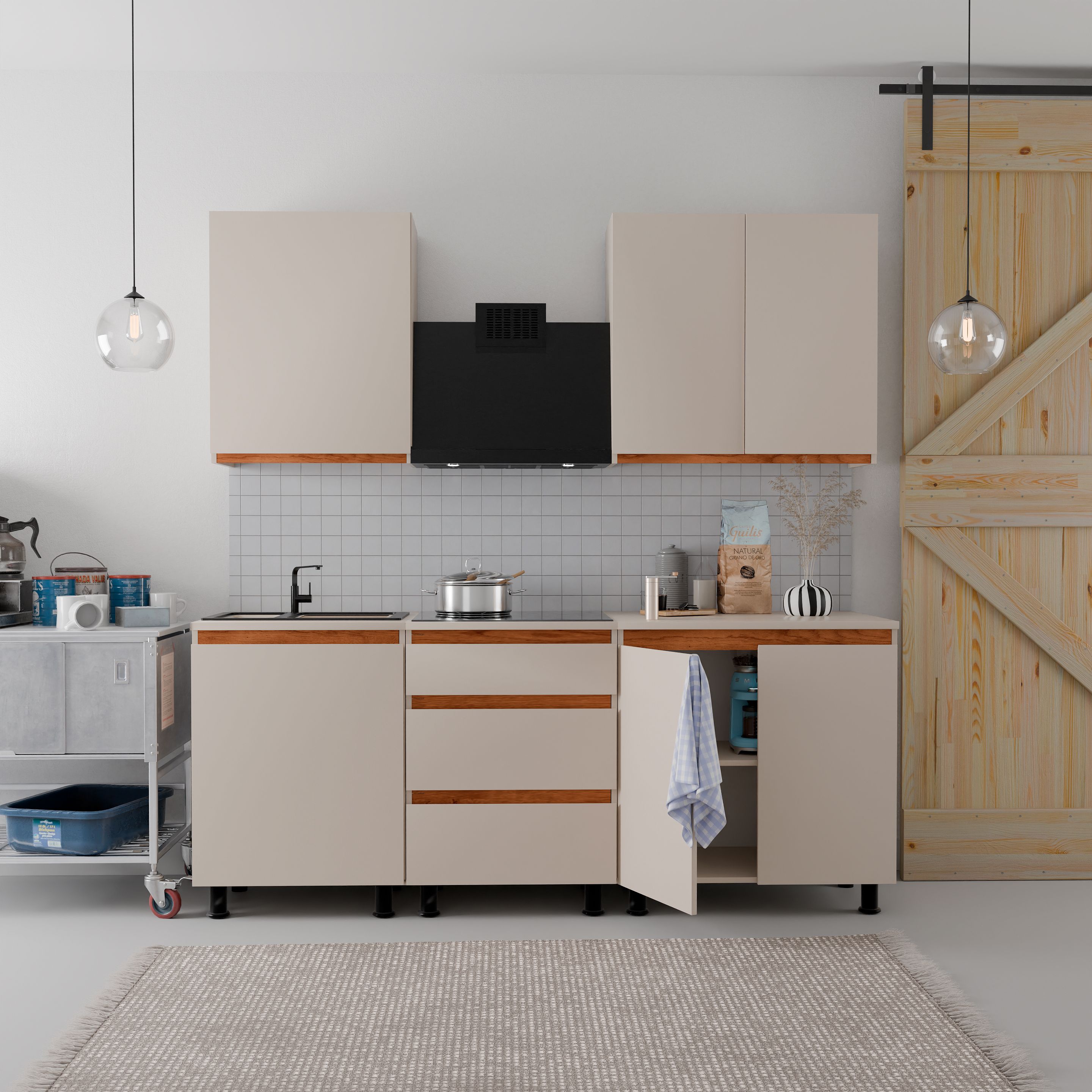 Универсальный напольный кухонный модуль в современном стиле отличается лаконичным дизайном со скрытыми ручками и декоративными вставками из массива дуба, что придает уникальность каждому элементу мебели.