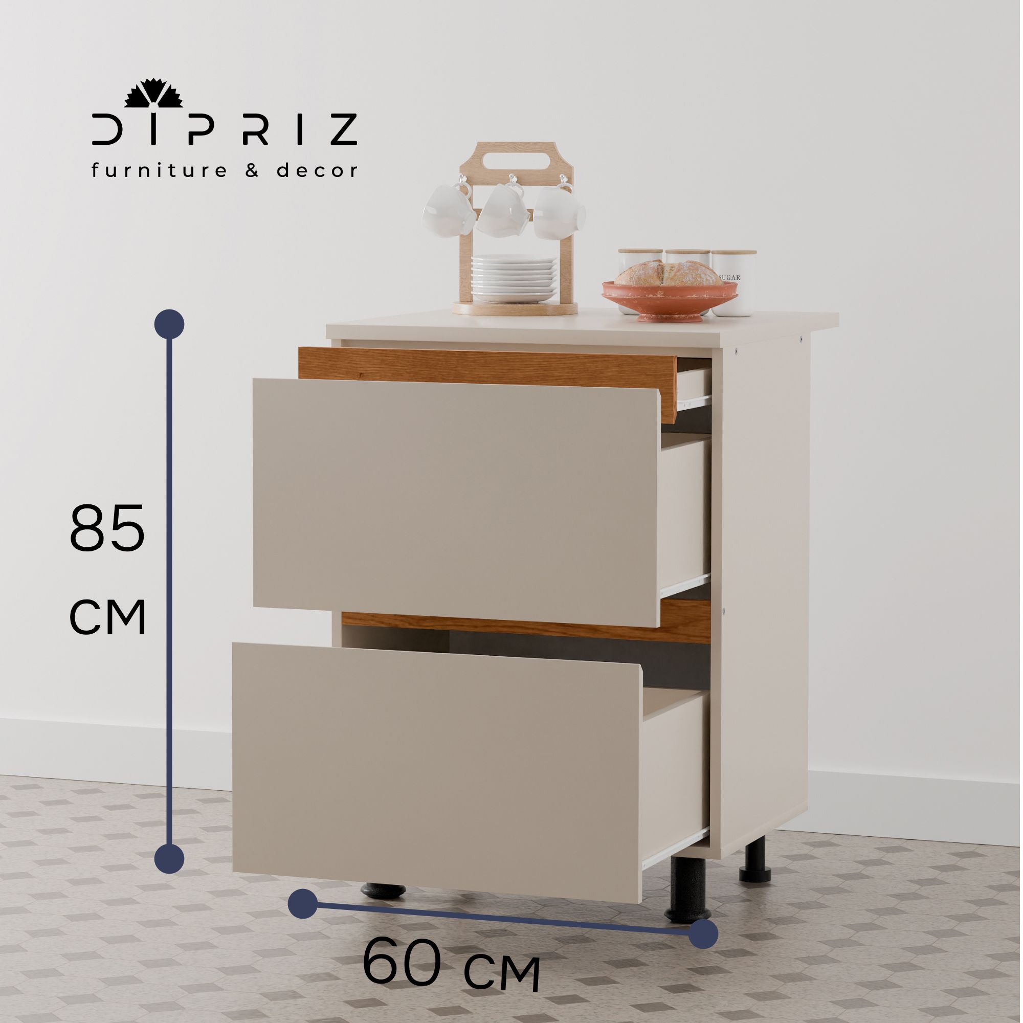 Конструкция кухонного модуля оснащена 3 ящиками: одним маленьким и двумя большими ящиками. Размеры шкафа под кухню в собранном виде (Ширина х Глубина х Высота, см) - 60х60х85 см, что позволит использовать его как в качестве небольшой кухонной тумбы, так и для создания полноценного кухонного гарнитура серии Виго. Вариант модуля кухни поставляется со столешницей размерами 60х60 см, толщина - 22 мм. Столешница выполнена с гладкими краями и кромками, что предотвращает случайные травмы и удары при использовании.