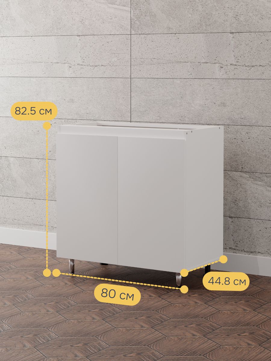 Конструкция кухонного модуля оснащена 2 распашными дверями и одной регулируемой по высоте съемной полкой. Размеры шкафа под кухню в собранном виде (Ширина х Глубина х Высота, см) - 80х44.8х82.5 см, что позволит использовать его как в качестве небольшой кухонной тумбы, так и для создания полноценного кухонного гарнитура серии Севилья. Обратите внимание, что этот вариант модуля кухни поставляется без столешницы.