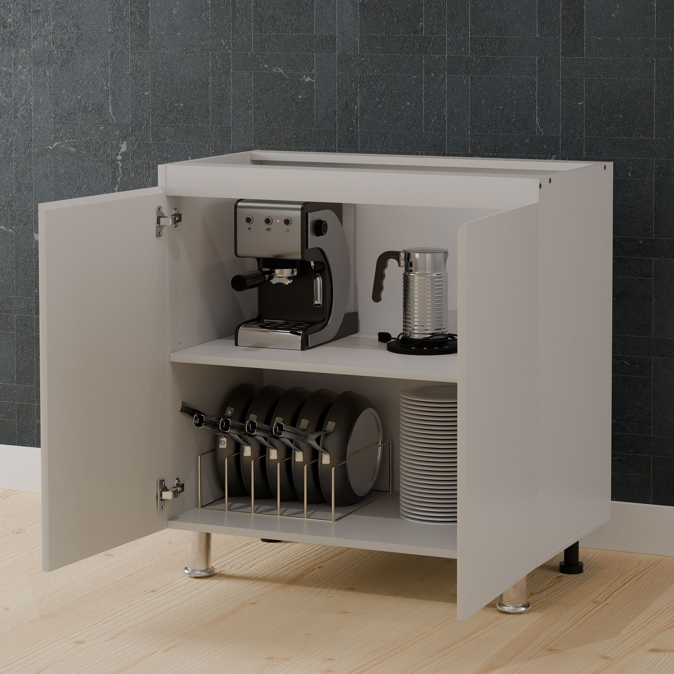 Двери оснащены петлями с доводчиком от производителя Boyard, что обеспечивает легкость и плавность закрывания. Скрытые ручки с гладкими скосами позволят использовать кухонный модуль с удовольствием, предоставляя легкость доступа и уборки. Съемная полка может устанавливаться в 3 положениях и рассчитана на нагрузку до 5-10 кг, что позволяет хранить тяжелые кухонные принадлежности без опасений.