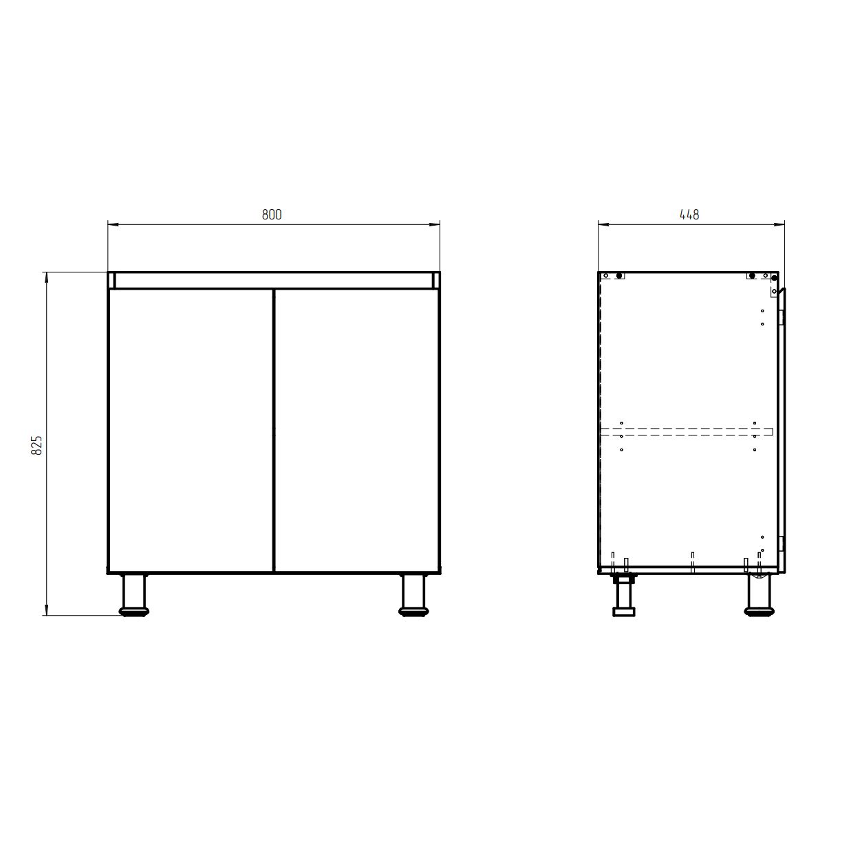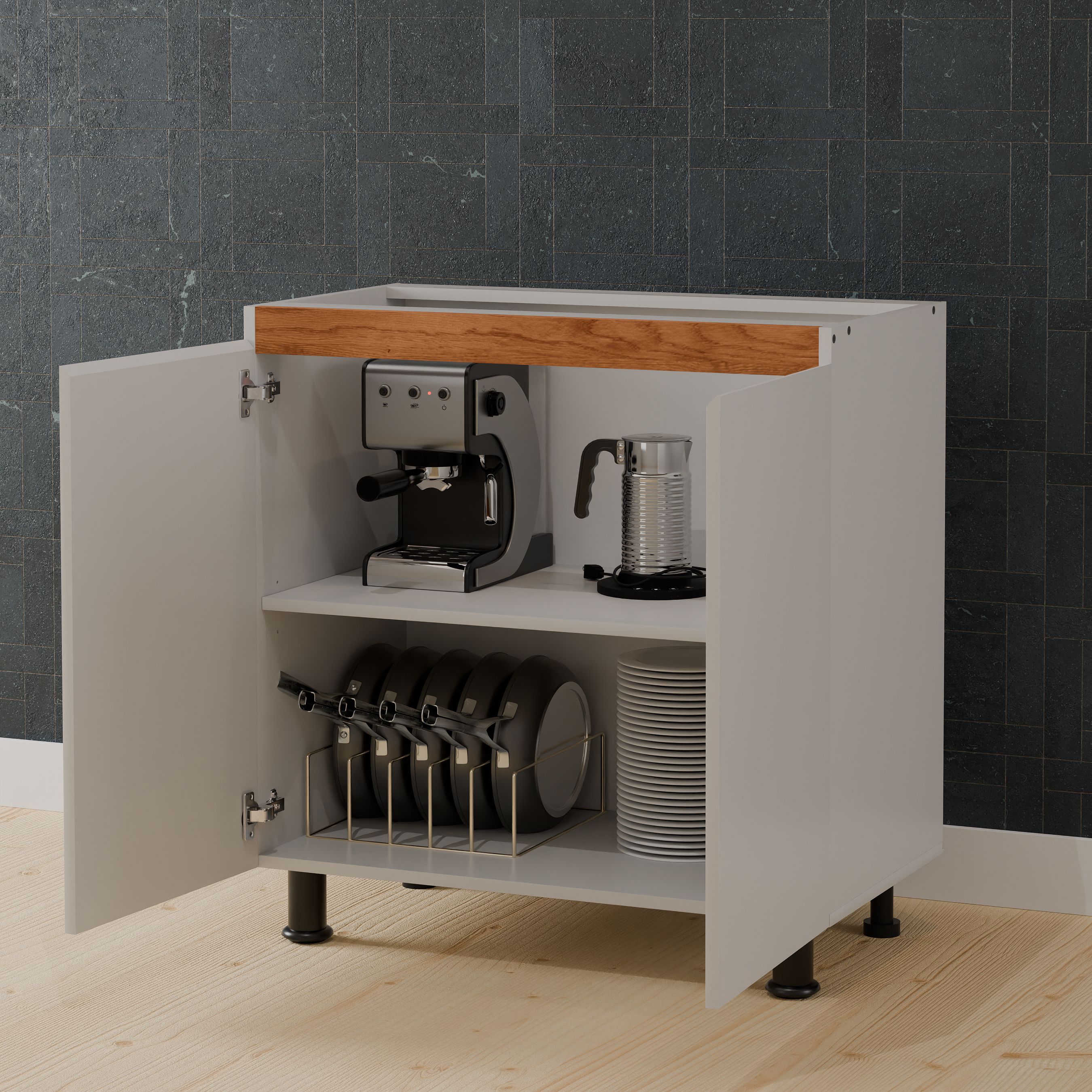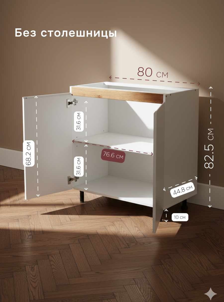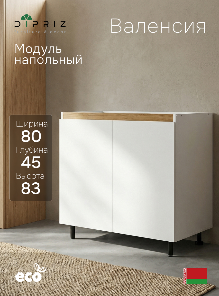 Конструкция кухонного модуля оснащена 2 распашными дверями и одной регулируемой по высоте съемной полкой. Размеры шкафа под кухню в собранном виде (Ширина х Глубина х Высота, см) - 80х44.8х82.5 см, что позволит использовать его как в качестве небольшой кухонной тумбы, так и для создания полноценного кухонного гарнитура серии Валенсия. Обратите внимание, что этот вариант модуля кухни поставляется без столешницы.