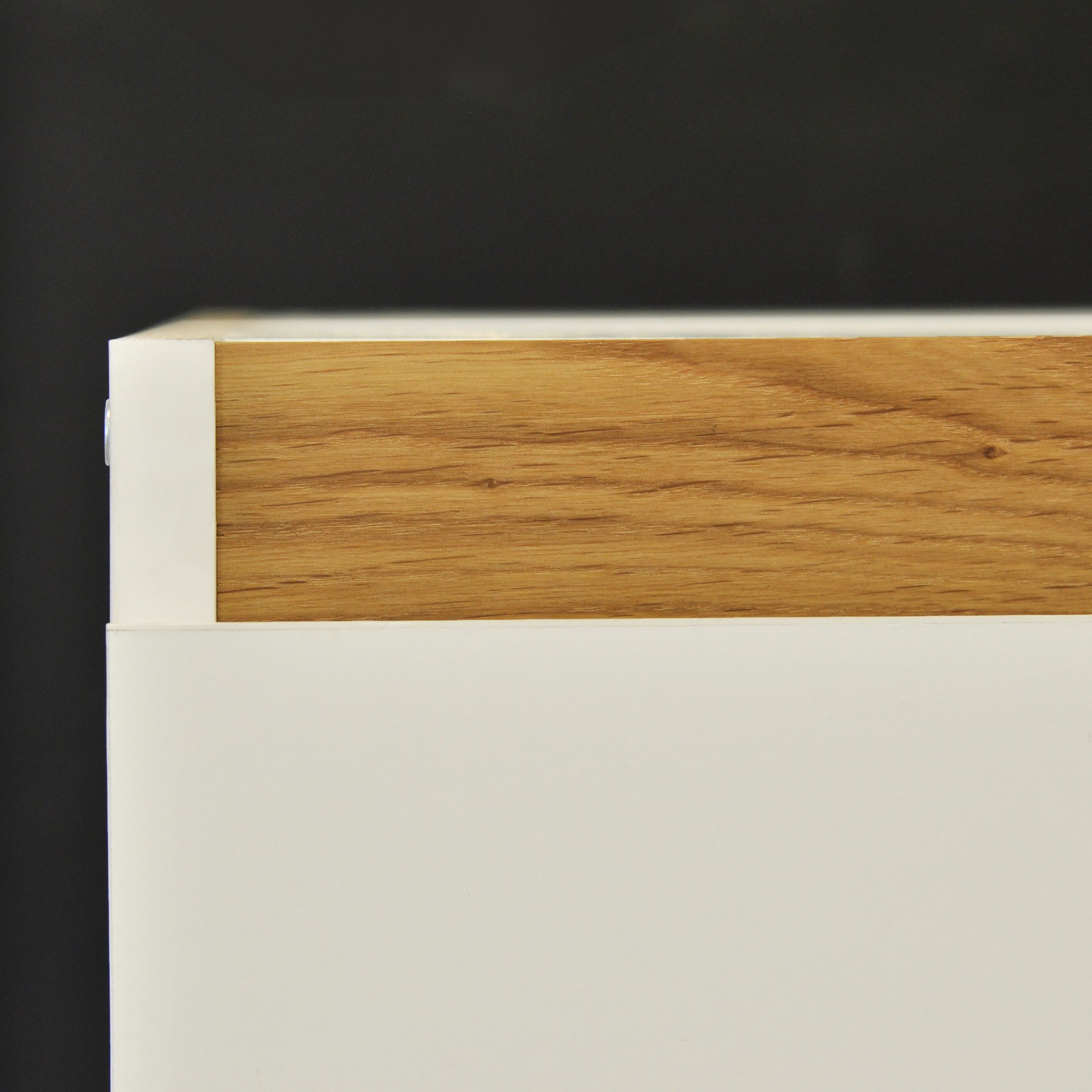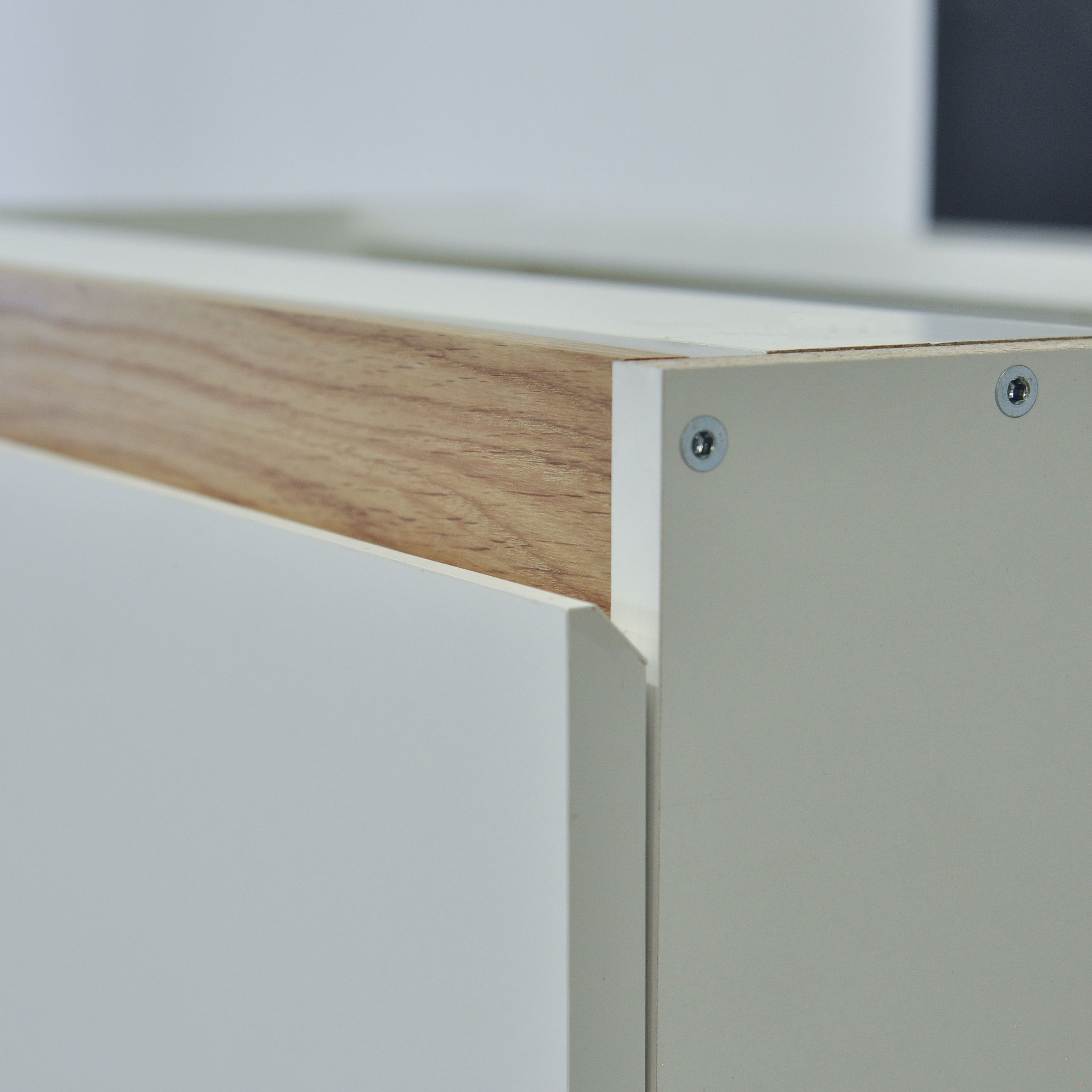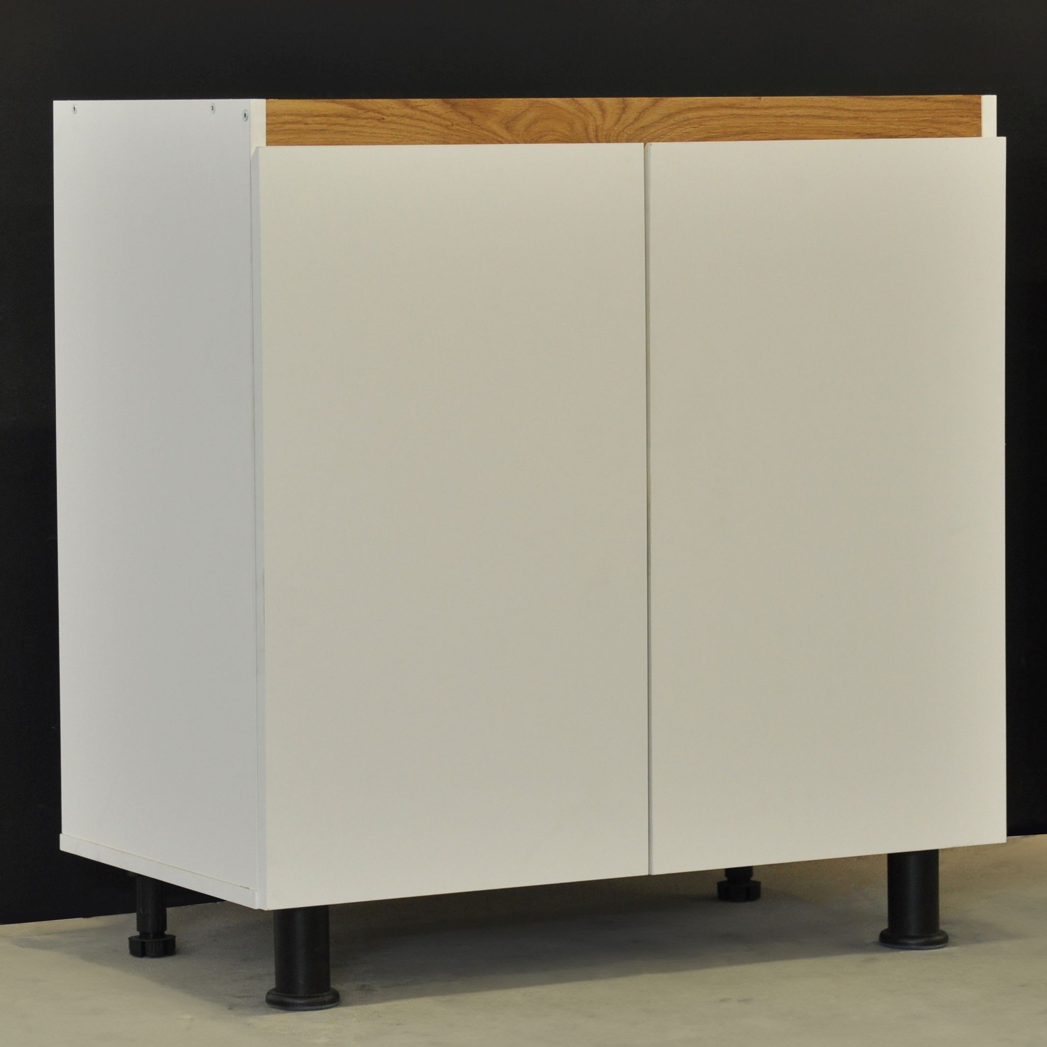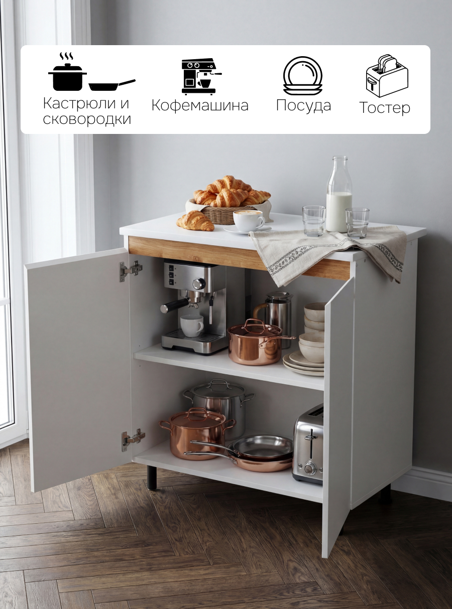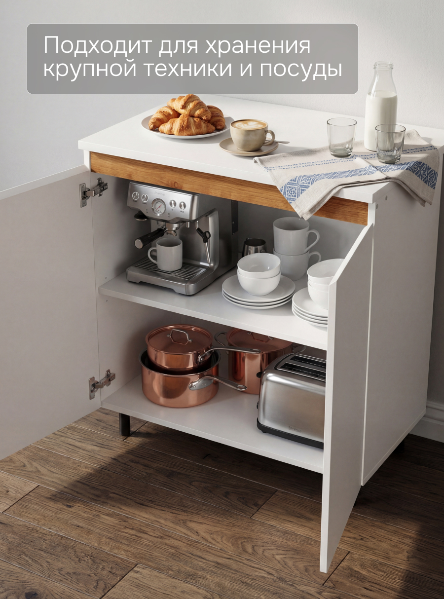Тумба на кухню изготовлена из качественного ламинированного ДСП (ЛДСП) с декоративными вставками из массива дуба, что обеспечивает долговечность и привлекательный внешний вид. При изготовлении шкафа использовалось только безопасное для человека ЛДСП в соответствии с европейскими нормами классов содержания формальдегида (не более 10 мг на 100 г). Имеет нежный белый цвет, поэтому мебель всегда будет придавать комнате приятный и светлый внешний вид. Задняя стенка выполнена из белого ДВП с целью облегчения конструкции, делая её более привлекательной и долговечной.