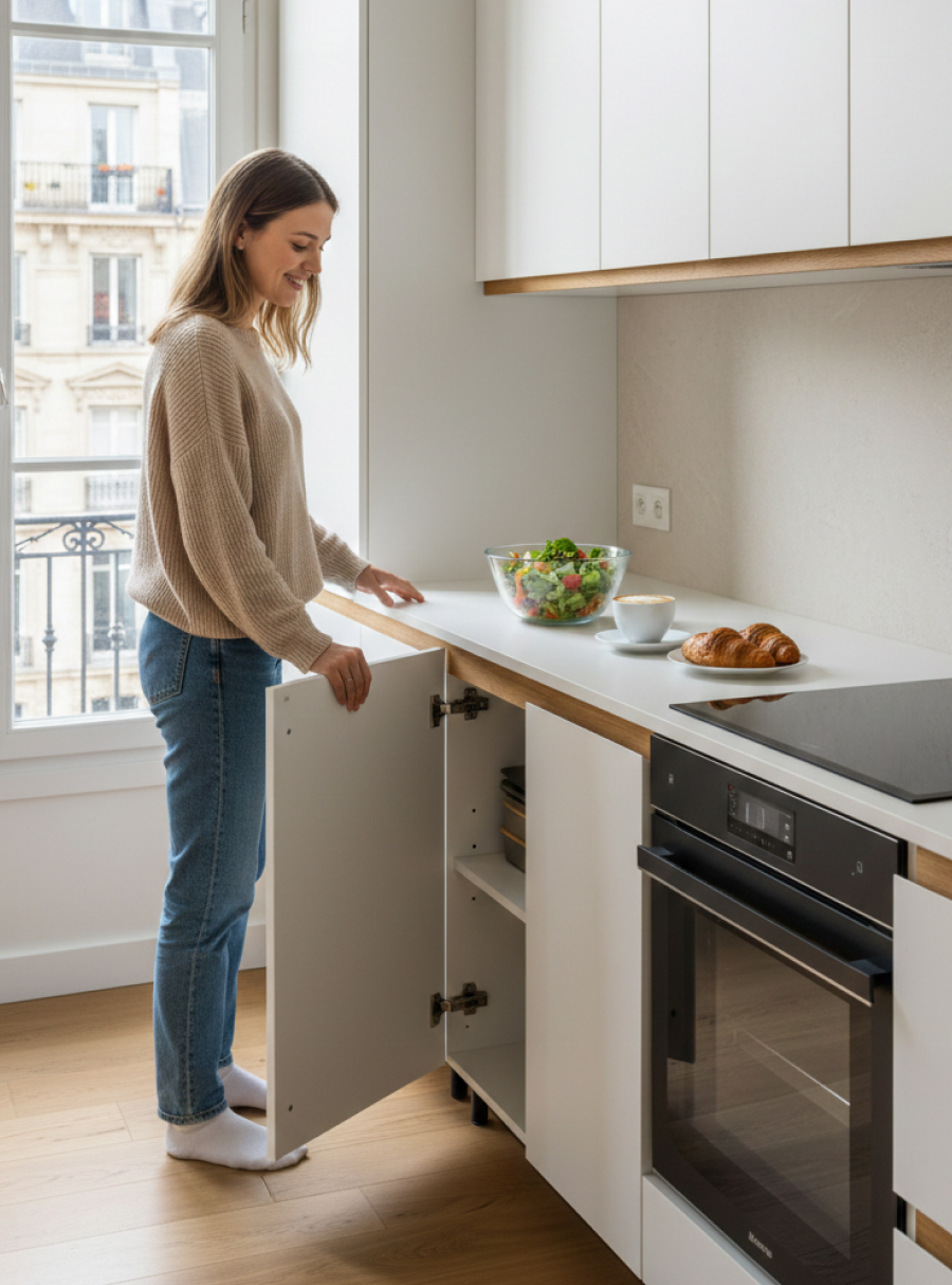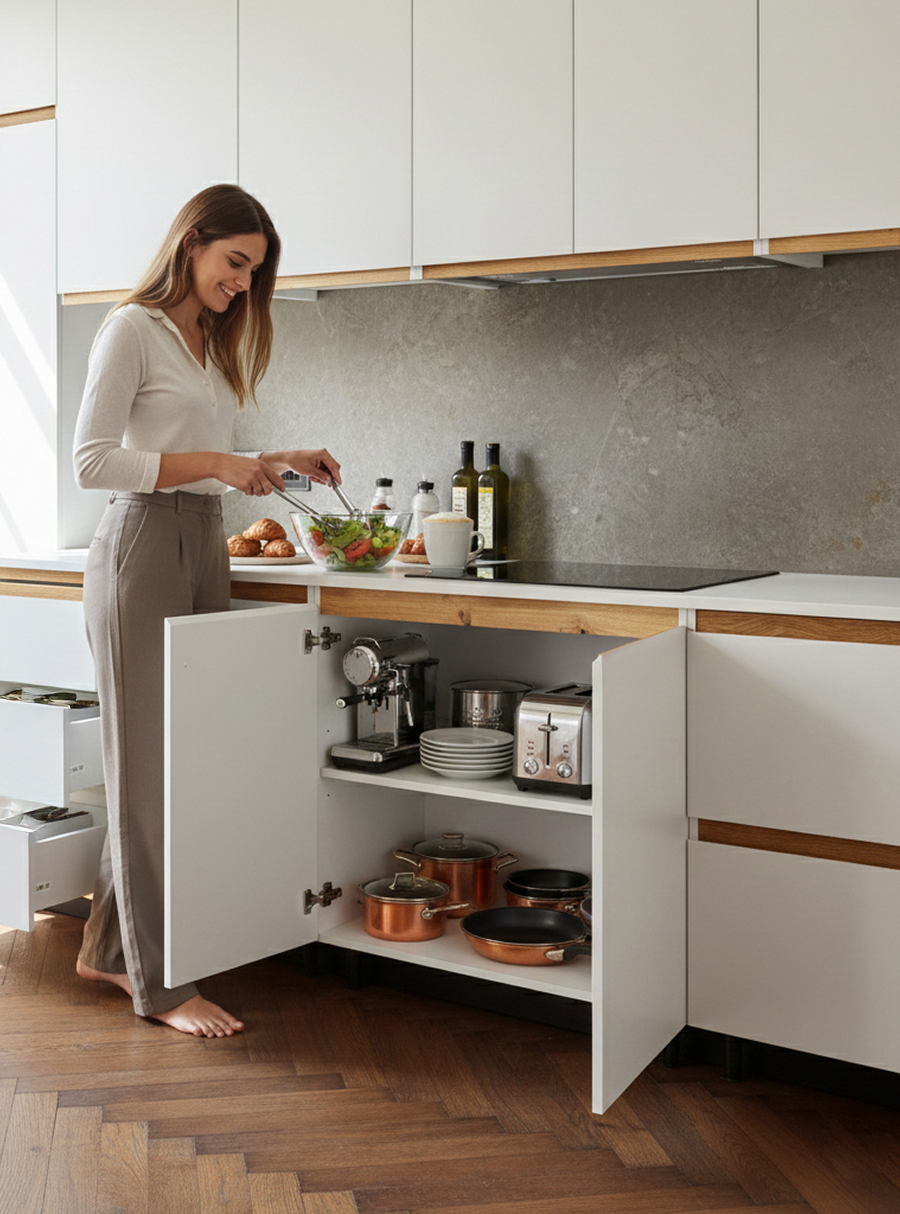 Двери оснащены петлями с доводчиком от производителя Boyard, что обеспечивает легкость и плавность закрывания. Скрытые ручки с гладкими скосами позволят использовать кухонный модуль с удовольствием, предоставляя легкость доступа и уборки. Съемная полка может устанавливаться в 3 положениях и рассчитана на нагрузку до 5-10 кг, что позволяет хранить тяжелые кухонные принадлежности без опасений.