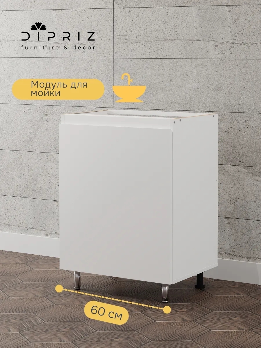 Конструкция тумбы под раковину оснащена распашной дверью и открытой задней стенкой для монтажа необходимых коммуникаций. Размеры кухонного шкафа в собранном виде (Ширина х Глубина х Высота, см) - 60х44.8х82.5 см, что позволит использовать его как в качестве небольшой кухонной тумбы, так и для создания полноценного кухонного гарнитура серии Севилья. Обратите внимание, что этот вариант тумбы под раковину поставляется без столешницы.