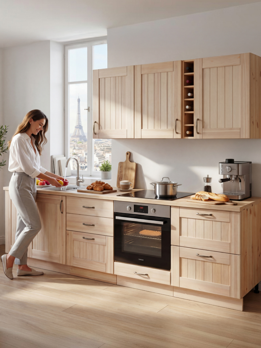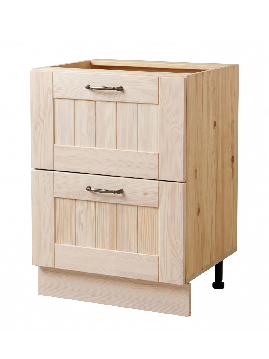 • Фасады: Филенчатые, с декоративными пазами, покрытые белесым лаком. Сквозь лак видна естественная текстура сосны.