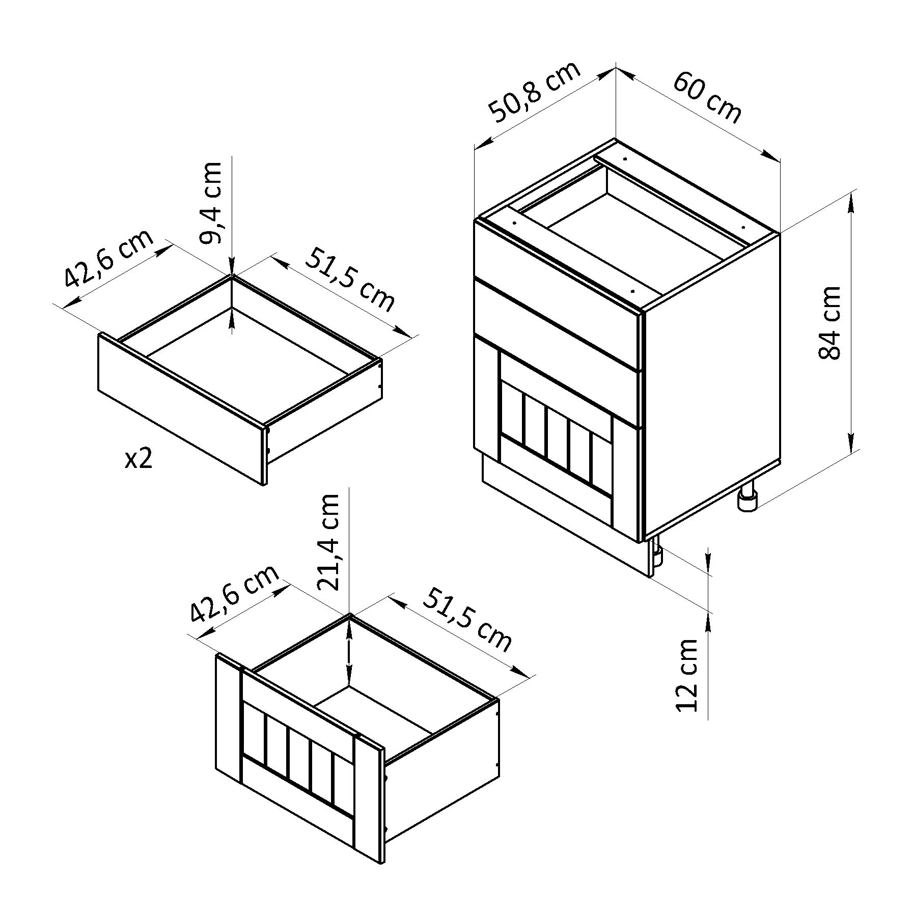 - Оснащён тремя просторными выдвижными ящиками, этот модуль идеально подходит для хранения кухонных принадлежностей и аксессуаров.