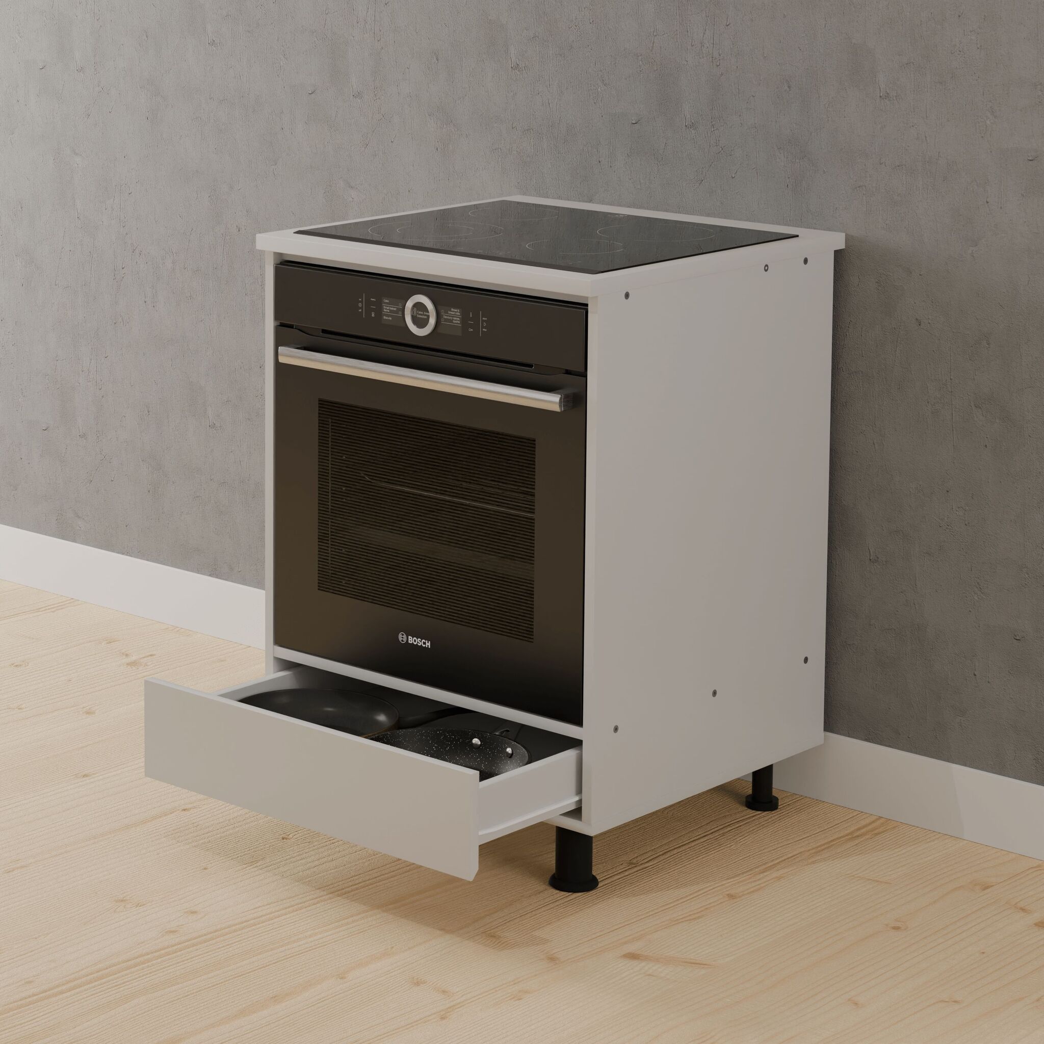Модуль под духовой шкаф оснащен достаточным пространством для размещения большинства современных духовых шкафов. Открытая задняя стенка рассчитана на монтаж необходимых коммуникаций, дно белого шкафа под духовой шкаф выдержит необходимую нагрузку, что позволит использовать его без опасений. Вместительный ящик под духовым шкафом позволит организовать все кухонные приборы в чистоте и порядке