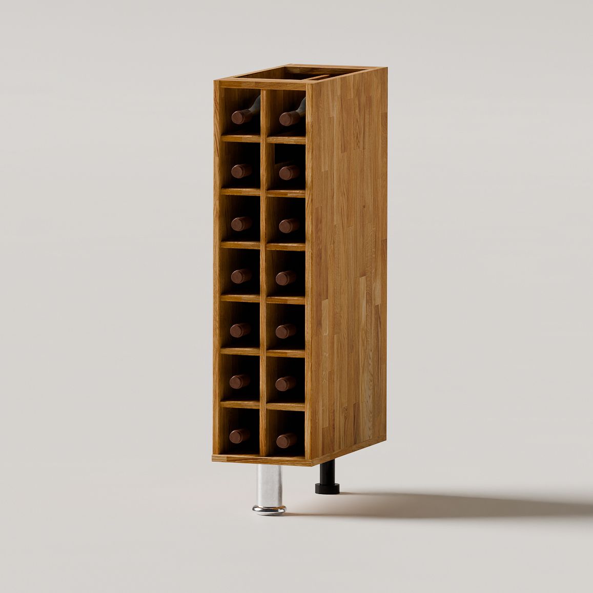 Конструкция винного шкафа для бутылок из массива дуба оснащена 14 нишами, которые подойдут для аккуратной организации пространства кухни и размещения различных предметов: от бутылок с любимыми напитками до специй и декора. Размеры шкафа под кухню в собранном виде (Ширина х Глубина х Высота, см) - 20х31х82.5 см, что позволит использовать его как в качестве небольшой кухонной тумбы для бутылок, так и для создания полноценного кухонного гарнитура серии Севилья. Этот вариант модуля кухни поставляется без столешницы.