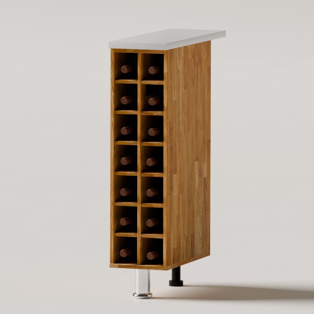 Конструкция винного шкафа для бутылок из массива дуба оснащена 14 нишами, которые подойдут для аккуратной организации пространства кухни и размещения различных предметов: от бутылок с любимыми напитками до специй и декора. Размеры шкафа под кухню в собранном виде (Ширина х Глубина х Высота, см) - 20х60х85 см, что позволит использовать его как в качестве небольшой кухонной тумбы для бутылок, так и для создания полноценного кухонного гарнитура серии Севилья. Вариант модуля кухни поставляется со столешницей размерами 20х60 см, толщина - 22 мм. Столешница выполнена с гладкими краями и кромками, что предотвращает случайные травмы и удары при использовании.