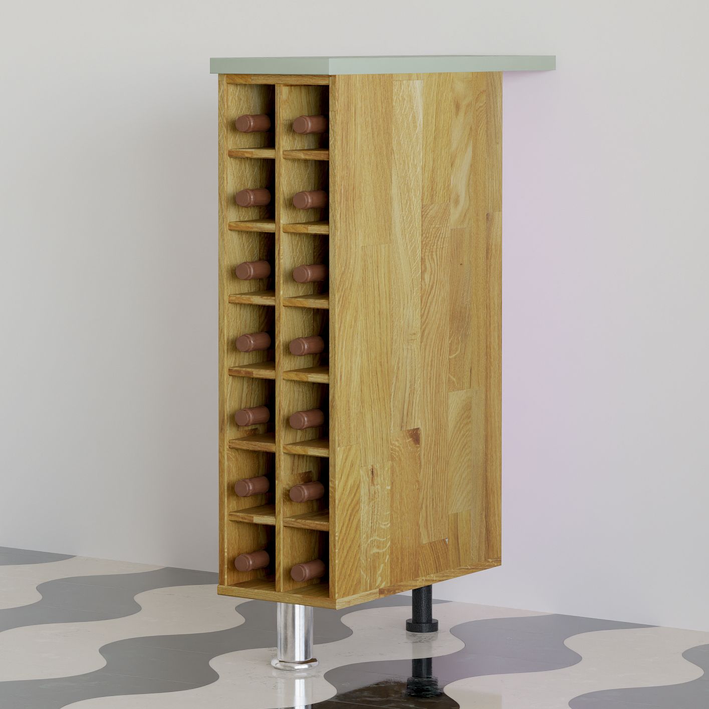 Конструкция винного шкафа для бутылок из массива дуба оснащена 14 нишами, которые подойдут для аккуратной организации пространства кухни и размещения различных предметов: от бутылок с любимыми напитками до специй и декора. Размеры шкафа под кухню в собранном виде (Ширина х Глубина х Высота, см) - 20х60х85 см, что позволит использовать его как в качестве небольшой кухонной тумбы для бутылок, так и для создания полноценного кухонного гарнитура серии Малага. Вариант модуля кухни поставляется со столешницей размерами 20х60 см, толщина - 22 мм. Столешница выполнена с гладкими краями и кромками, что предотвращает случайные травмы и удары при использовании.