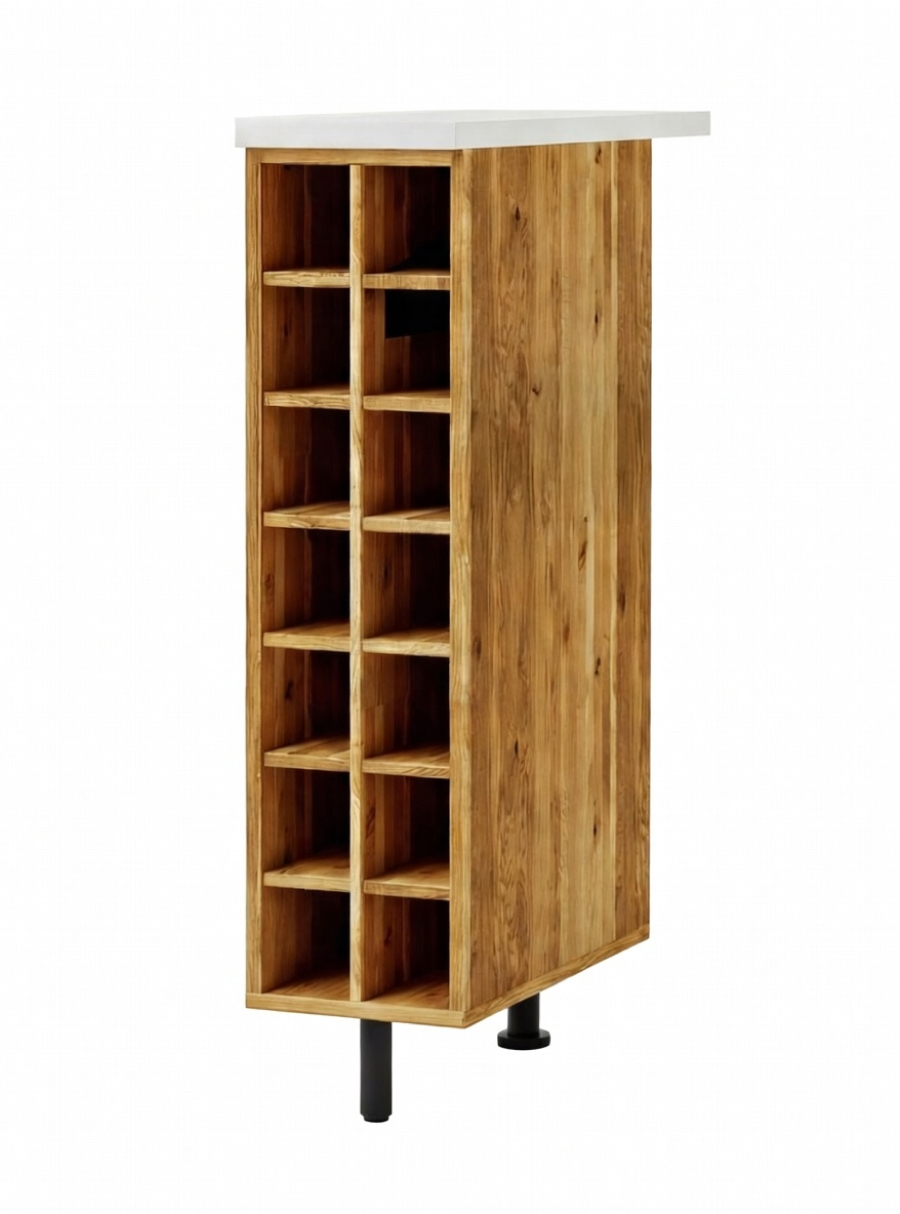 Конструкция винного шкафа для бутылок из массива дуба оснащена 14 нишами, которые подойдут для аккуратной организации пространства кухни и размещения различных предметов: от бутылок с любимыми напитками до специй и декора. Размеры шкафа под кухню в собранном виде (Ширина х Глубина х Высота, см) - 20х60х85 см, что позволит использовать его как в качестве небольшой кухонной тумбы для бутылок, так и для создания полноценного кухонного гарнитура серии Валенсия. Вариант модуля кухни поставляется со столешницей размерами 20х60 см, толщина - 22 мм. Столешница выполнена с гладкими краями и кромками, что предотвращает случайные травмы и удары при использовании.