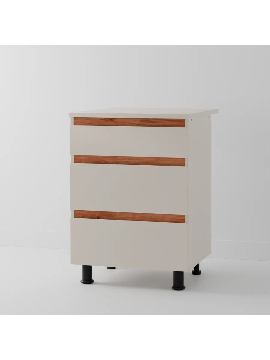 Конструкция кухонного модуля оснащена 3 ящиками: одним маленьким и двумя большими ящиками. Размеры шкафа под кухню в собранном виде (Ширина х Глубина х Высота, см) - 60х44.8х82.5 см, что позволит использовать его как в качестве небольшой кухонной тумбы, так и для создания полноценного кухонного гарнитура серии Виго. Вариант напольного кухонного модуля поставляется без столешницы.