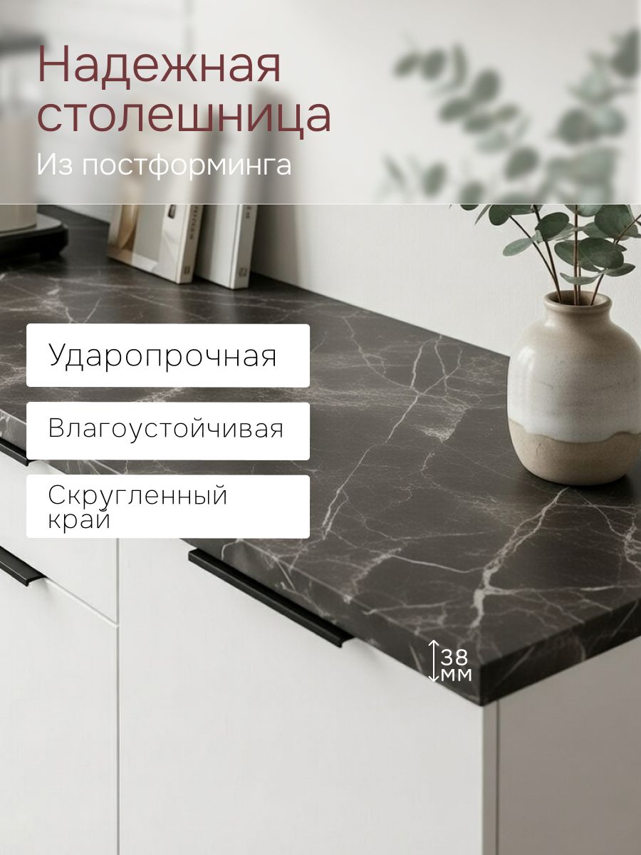 Корпус и фасады выполнены из прочной ЛДСП с защитным ламинированным покрытием. Материал устойчив к появлению царапин, сколов и воздействию бытовой влажности, что гарантирует долгий срок службы даже при активном использовании. Качественная фурнитура обеспечивает плавное и бесшумное закрывание ящиков и дверей.