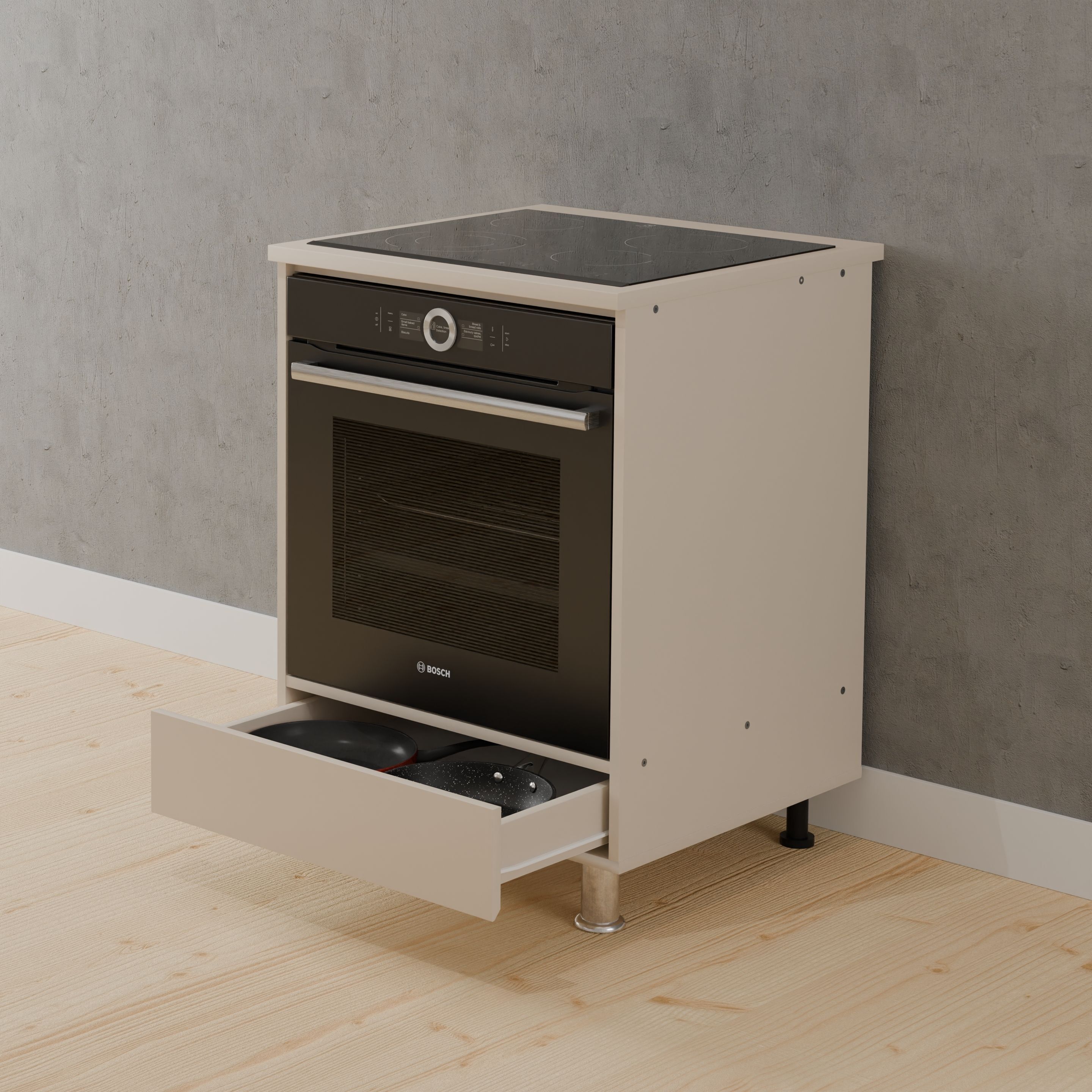 - Нижний выдвижной ящик на металлических роликовых направляющих с нагрузкой до 5 кг — идеальное место для хранения противней, форм и кухонных принадлежностей