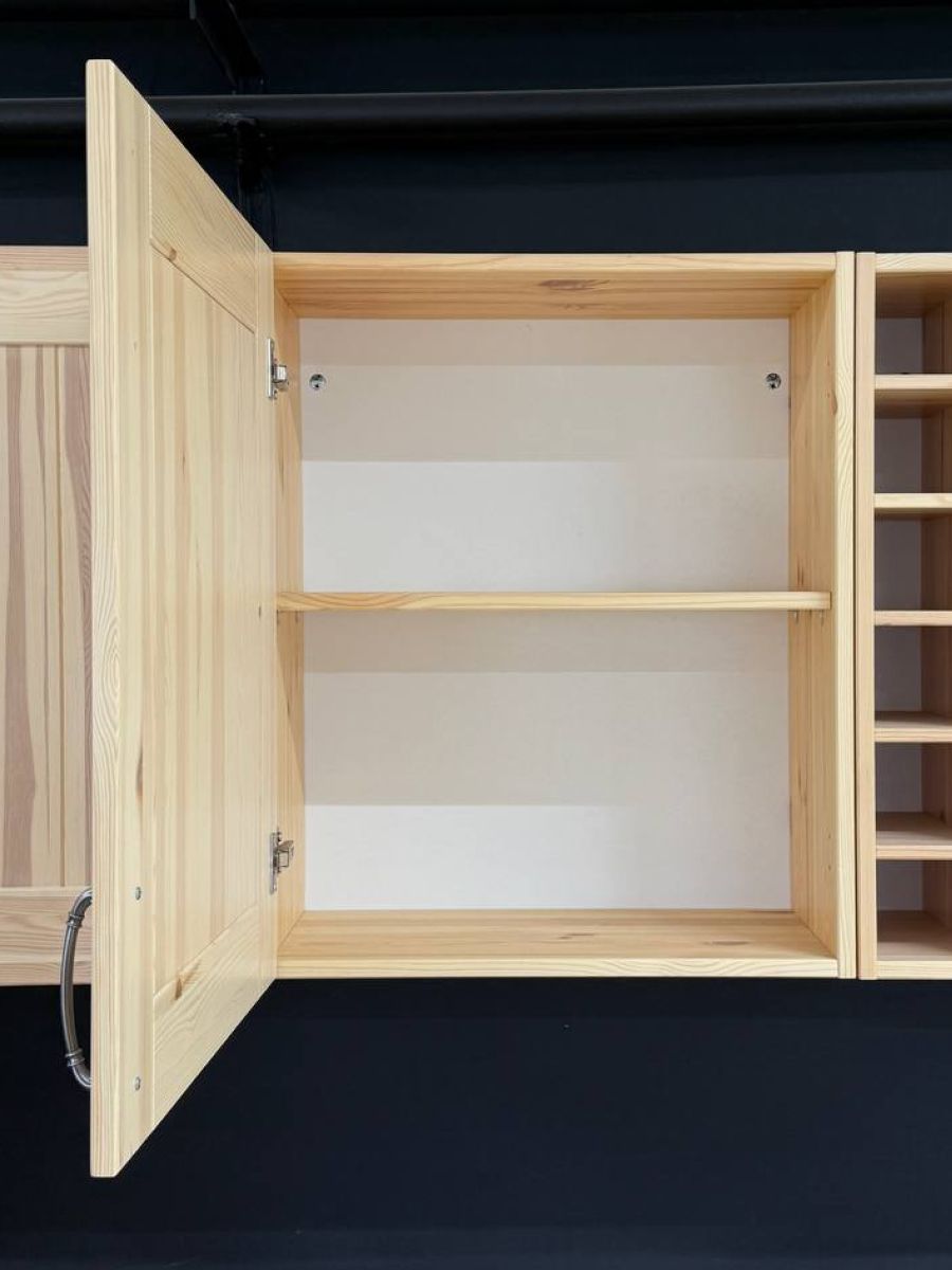 • Фасады: Филенчатые, с декоративными пазами, покрытые белесым лаком. Сквозь лак видна естественная текстура сосны.