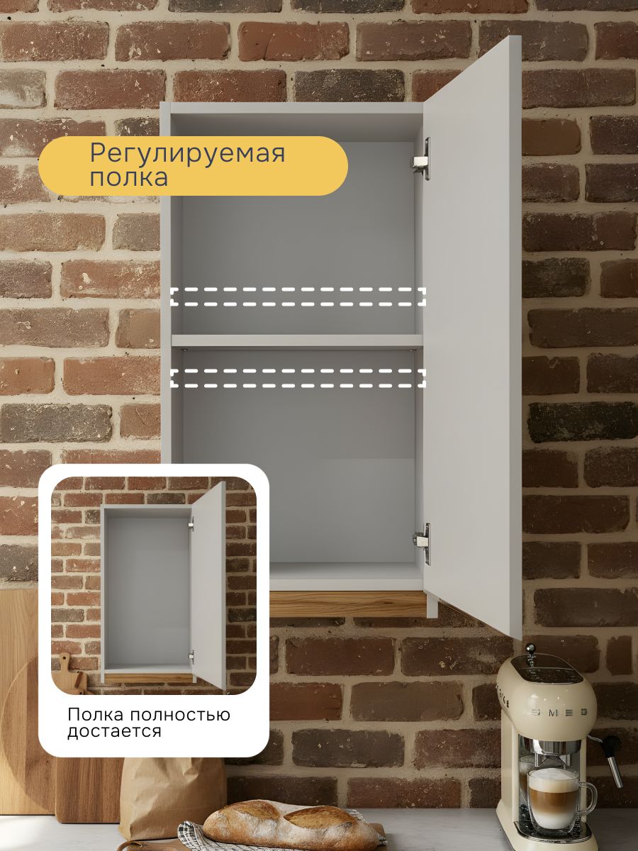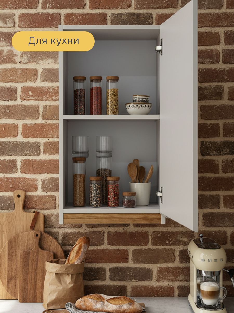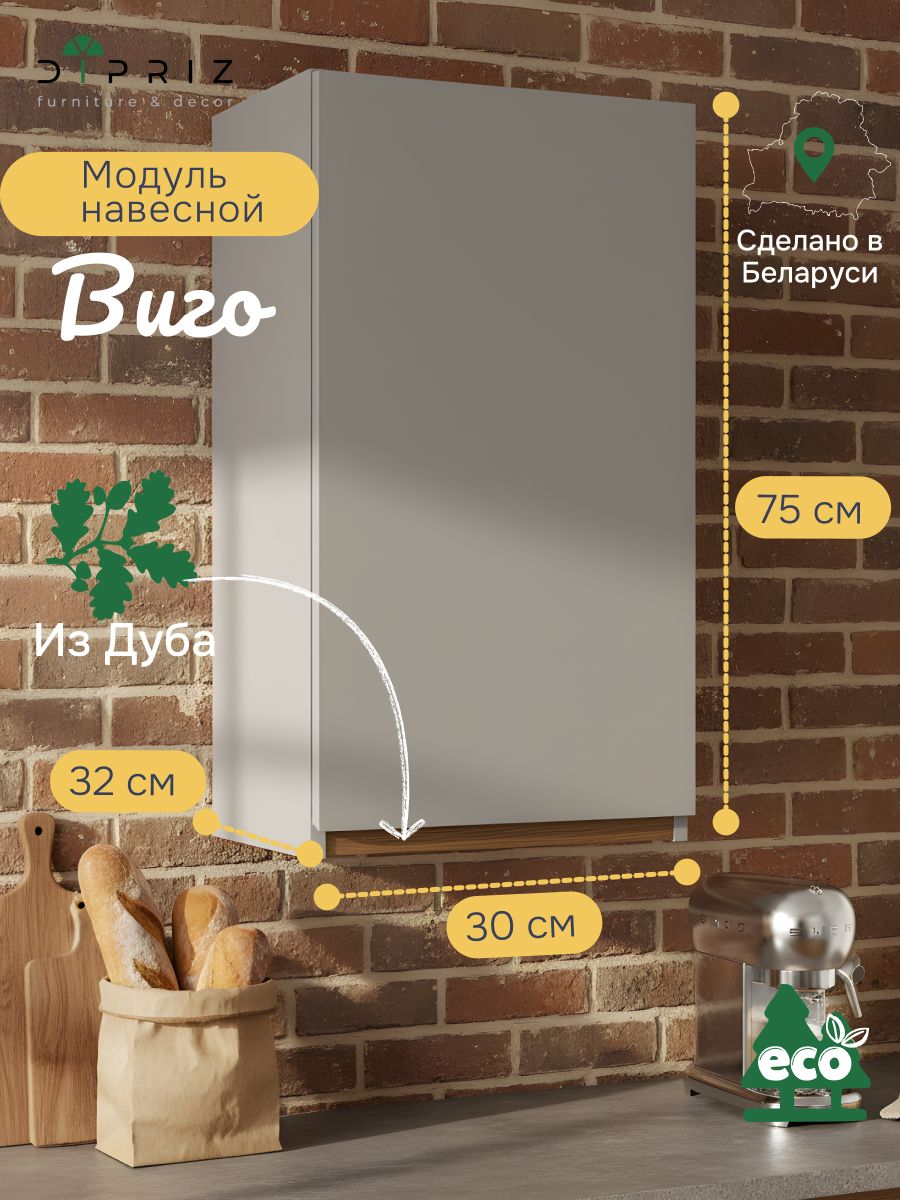 - Компактность и универсальность: Узкая ширина 30 см делает этот навесной модуль идеальным для небольших кухонь, рабочих зон над мойкой или варочной поверхностью, а также для организации угловых пространств.