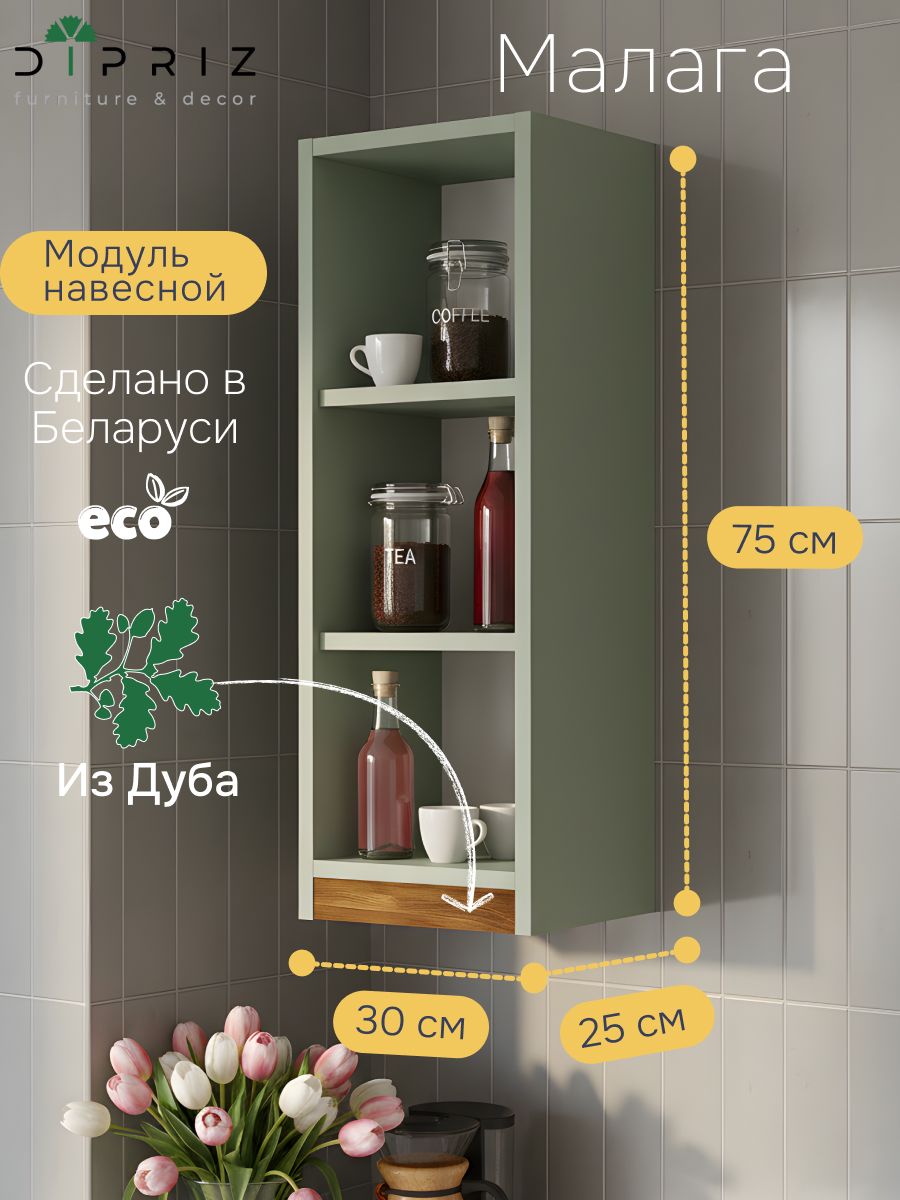 - Удобная высота - высота навесного кухонного модуля Малага составляет 75 см, что делает его универсальным выбором для людей любого роста.
