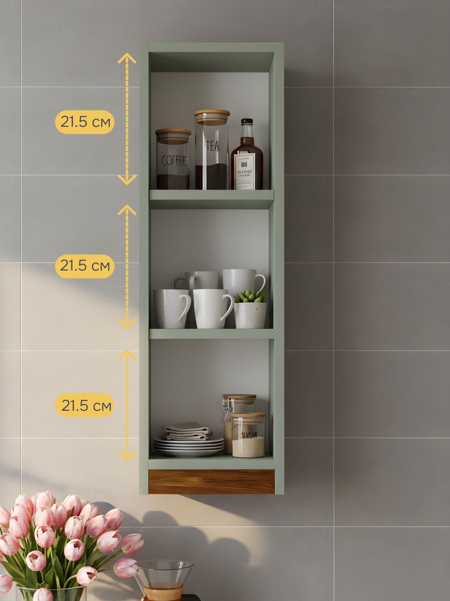- Прочный корпус - Стенки из прочного ЛДСП цвета зеленый самшит толщиной 22 мм выдерживает нагрузку в диапазоне 30-40 кг, обеспечивая прочность и долговечность при использовании.