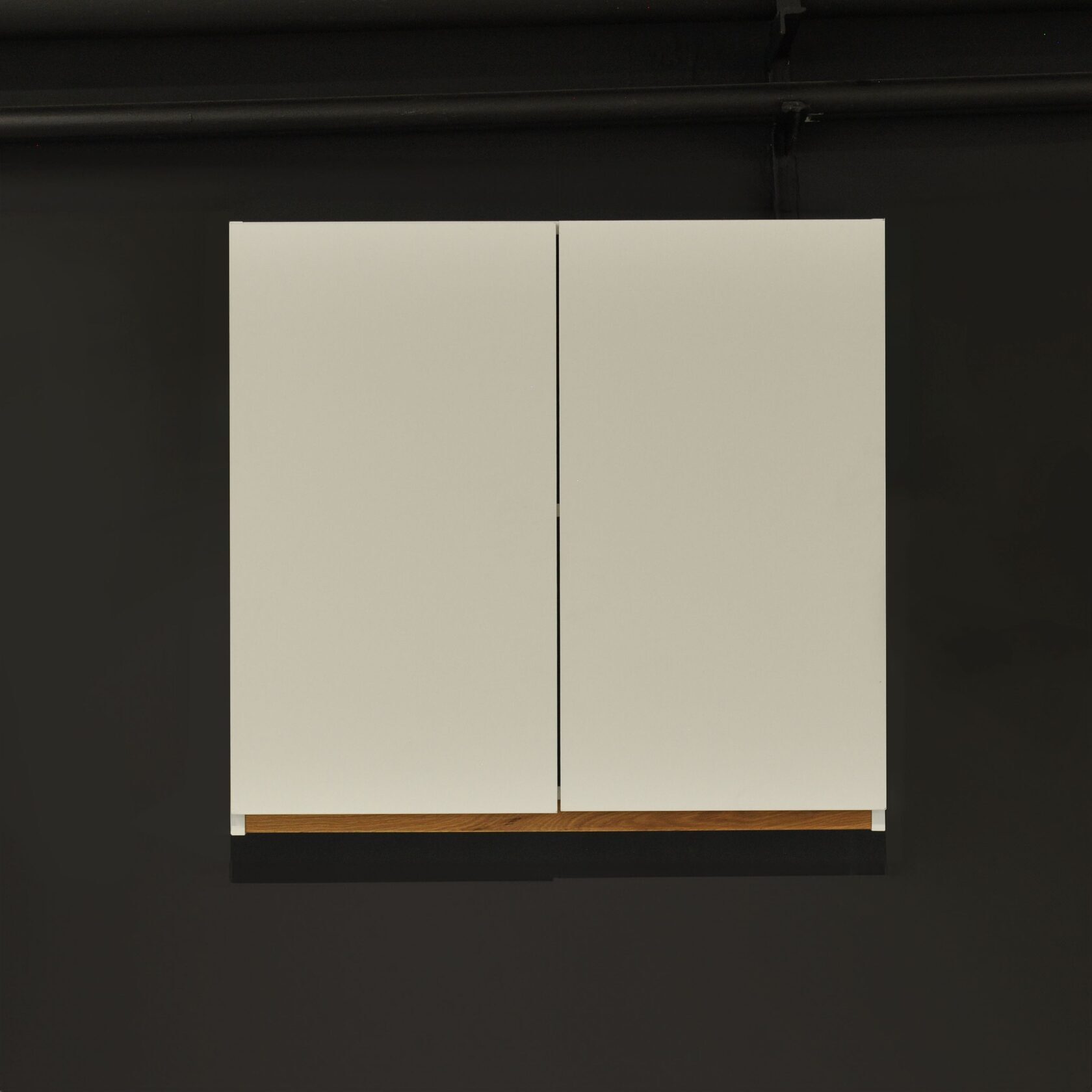 Универсальный навесной шкаф для кухни в современном стиле отличается лаконичным дизайном со скрытой ручкой и декоративными вставками из массива дуба, что придает уникальность каждому элементу мебели.