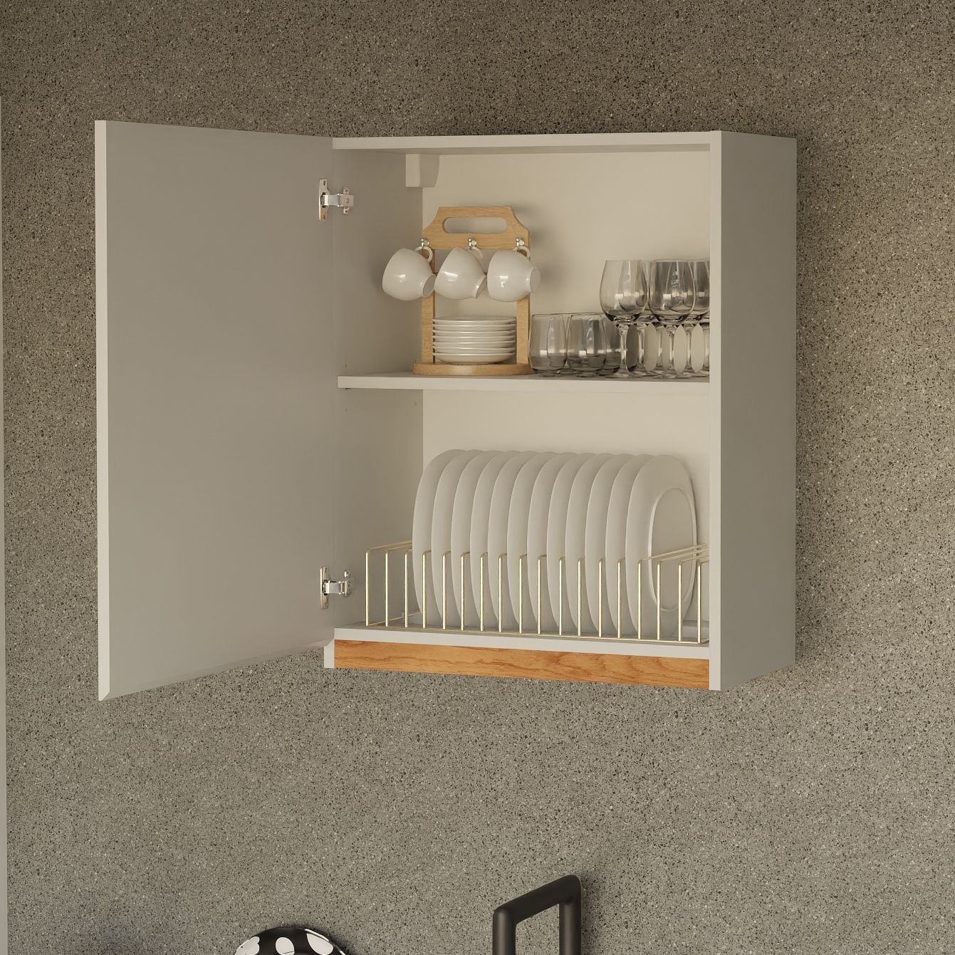 Конструкция кухонного модуля оснащена распашной дверью и вместительной полкой, которая может быть установлена в 3 положениях по высоте. Размеры кухонного шкафа в собранном виде (Ширина х Глубина х Высота, см) - 60х32х75 см, что позволит использовать его как в качестве небольшого подвесного шкафа для сушки посуды на кухню, так и для создания полноценного кухонного гарнитура серии Валенсия.