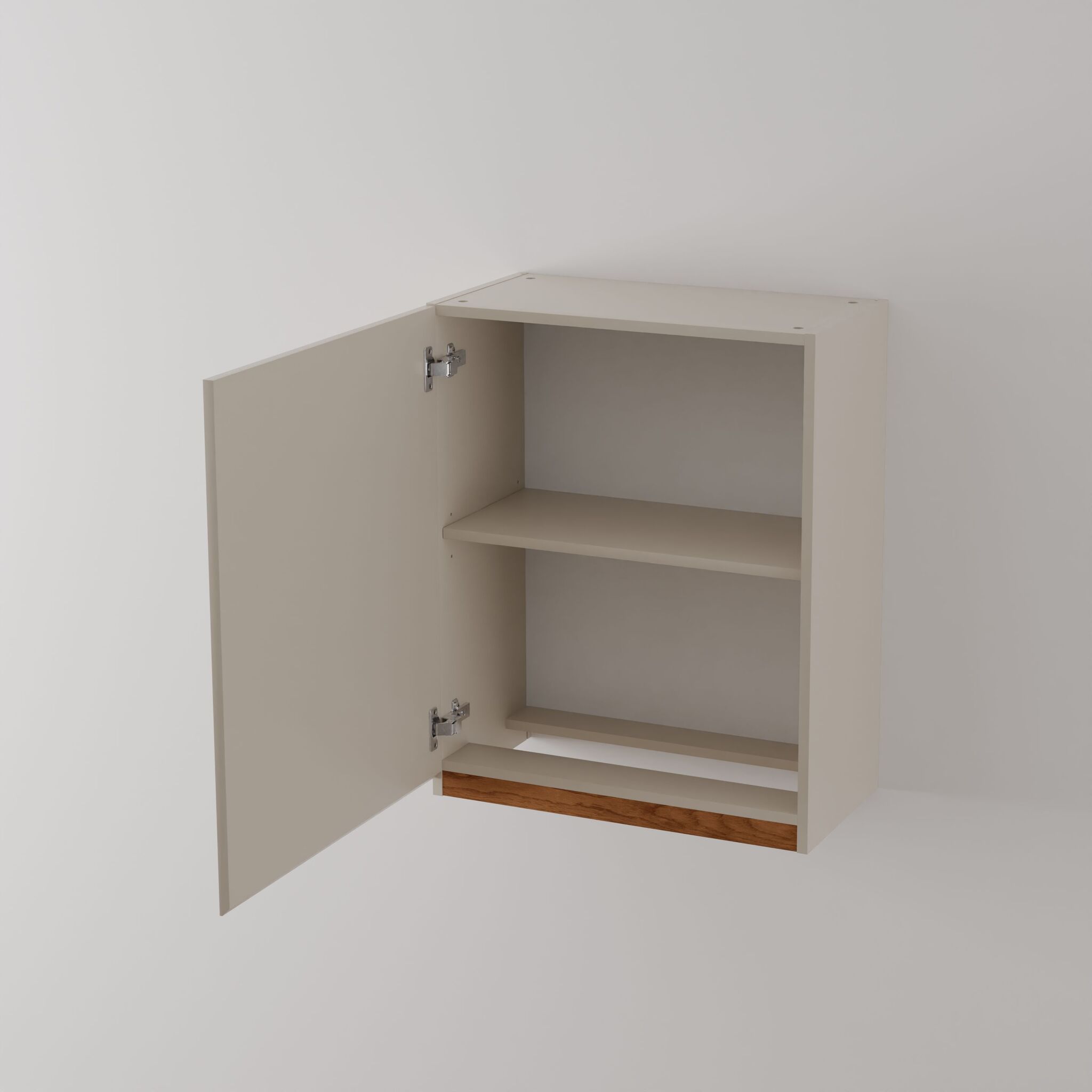 Дверь оснащена петлями с доводчиком от производителя Boyard, что обеспечивает легкость и плавность закрывания. Скрытая ручка с гладкими скосами позволит использовать кухонный модуль с удовольствием, предоставляя легкость доступа и уборки. Задняя стенка выполнена из белого ДВП, полка навесного шкафа выдержит нагрузку до 5-10 кг, что позволяет хранить тяжелые кухонные принадлежности без опасений.