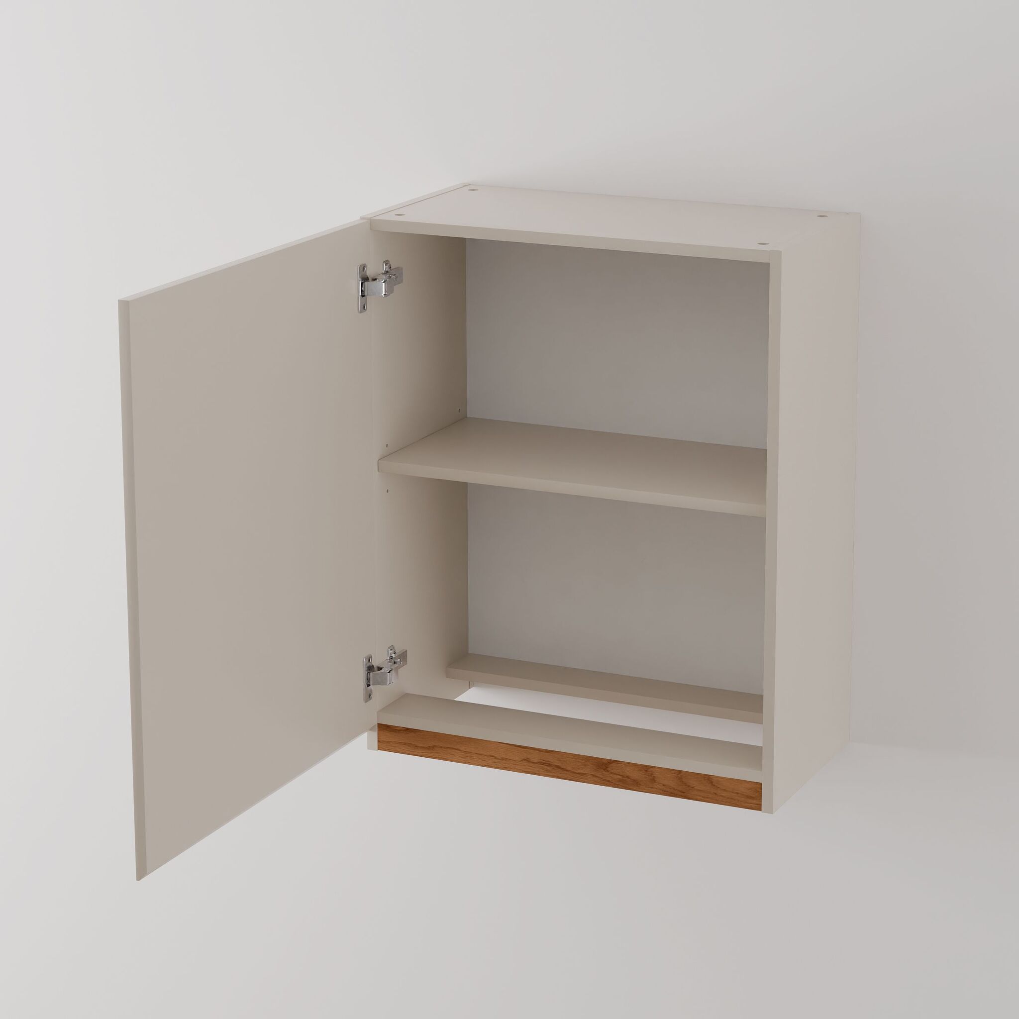 Универсальный навесной шкаф для кухни в современном стиле отличается лаконичным дизайном со скрытой ручкой и декоративными вставками из массива дуба, что придает уникальность каждому элементу мебели.