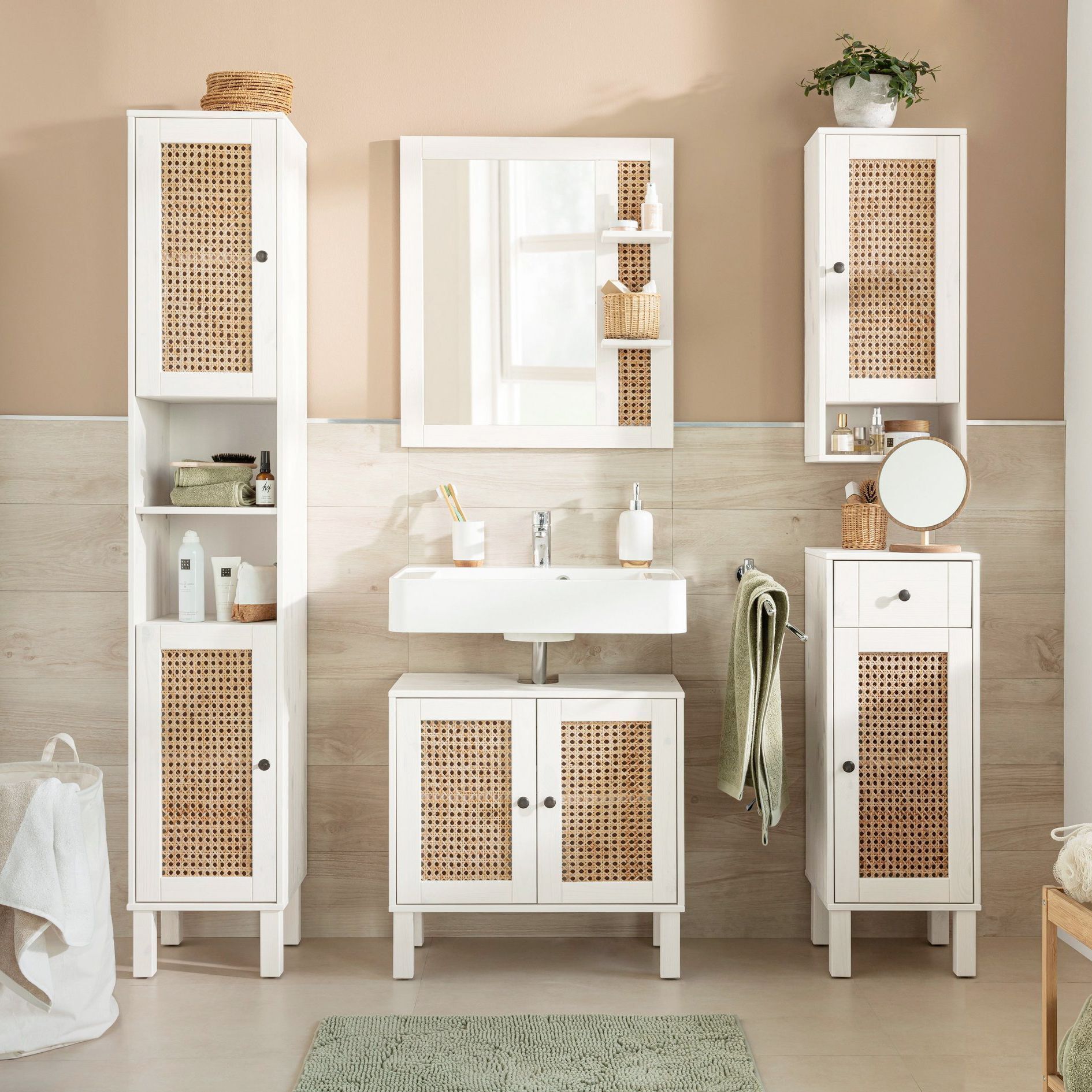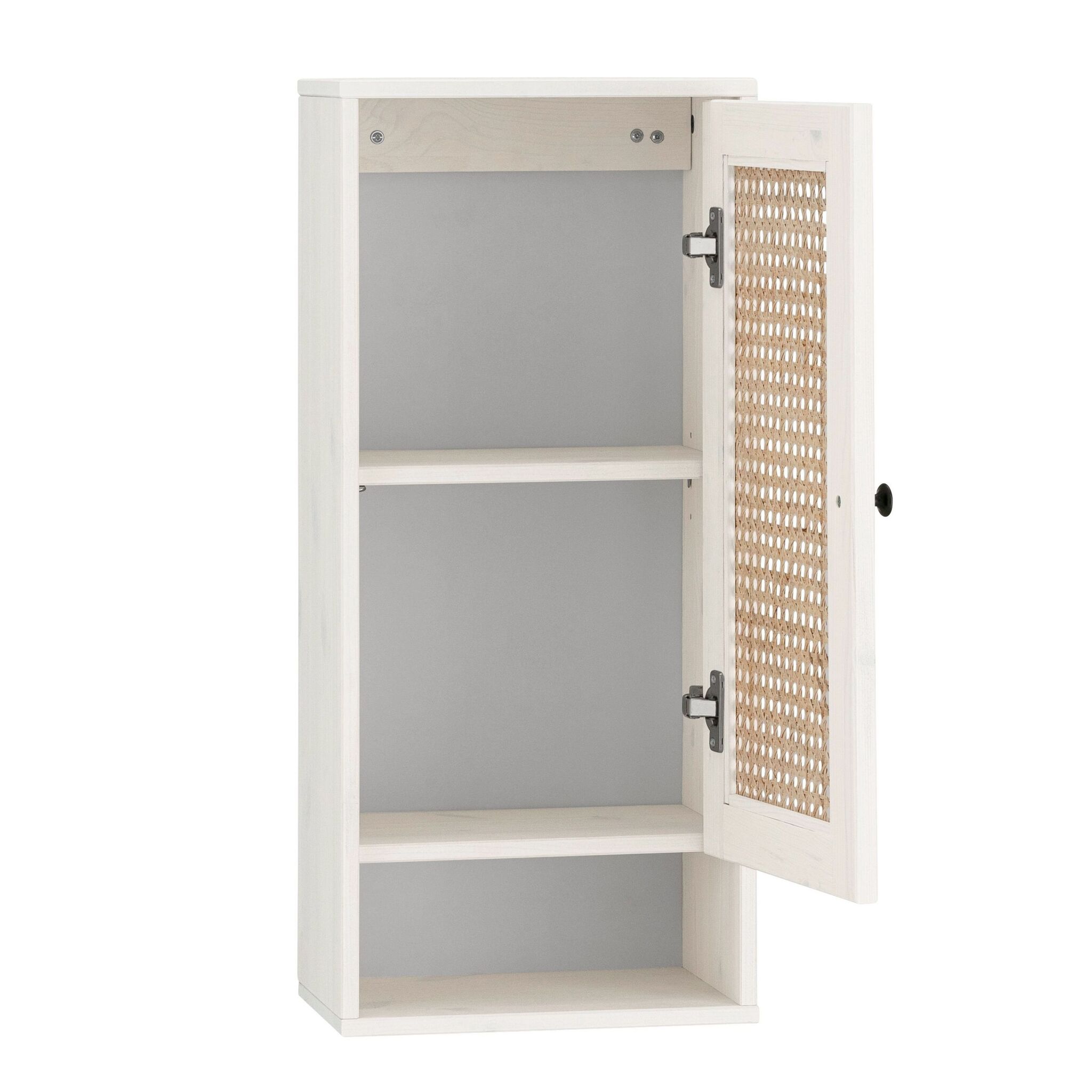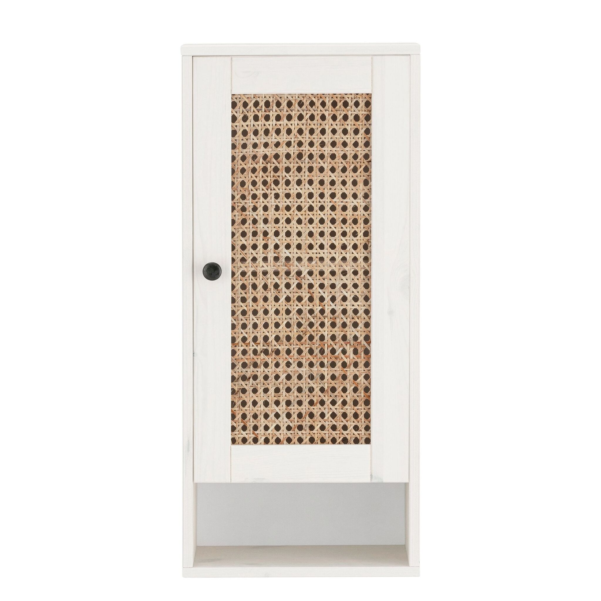 Изящный навесной шкаф для ванной комнаты изготовлен из массива сосны. Дверь украшена ротанговой вставочкой, которая станет изюминкой в дизайне вашей ванной комнаты. За дверкой можно хранить косметику, кремы и другие предметы ванной комнаты. На полочке снизу удобно расставлять предметы, которые должны быть в секундной доступности.
