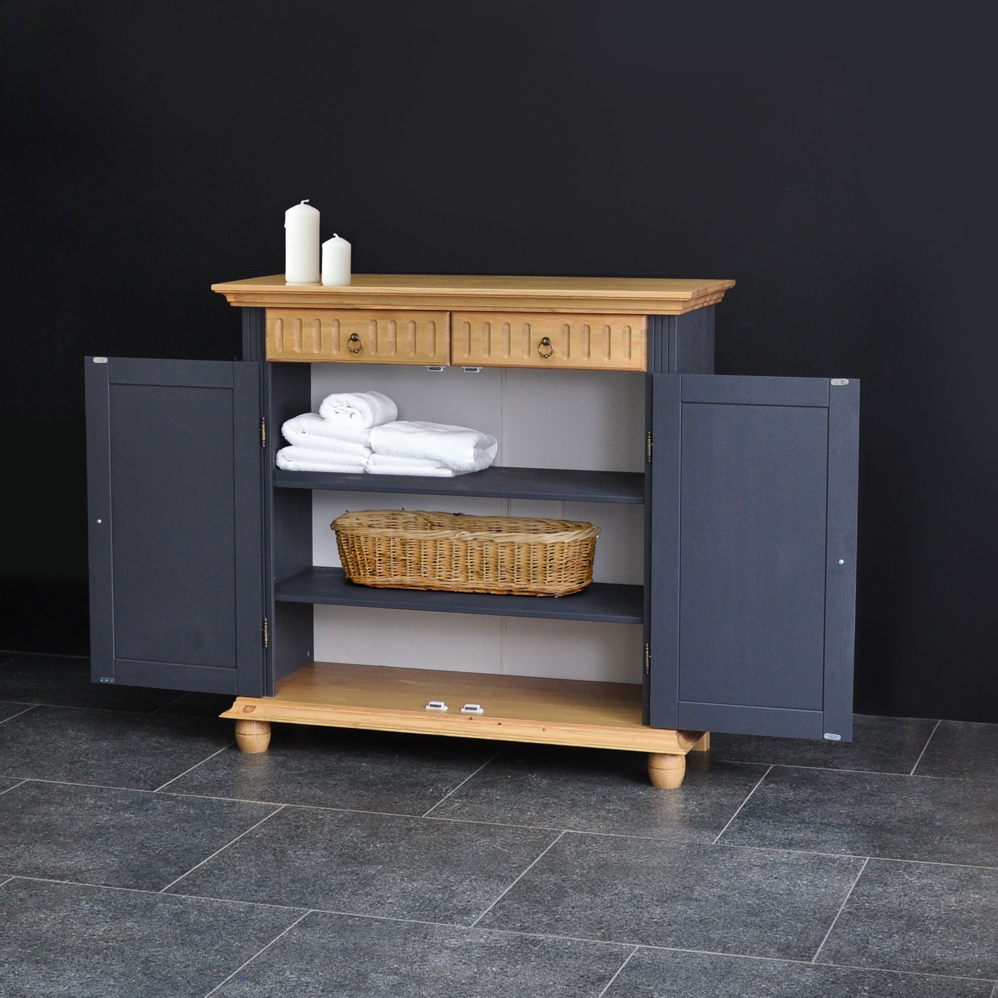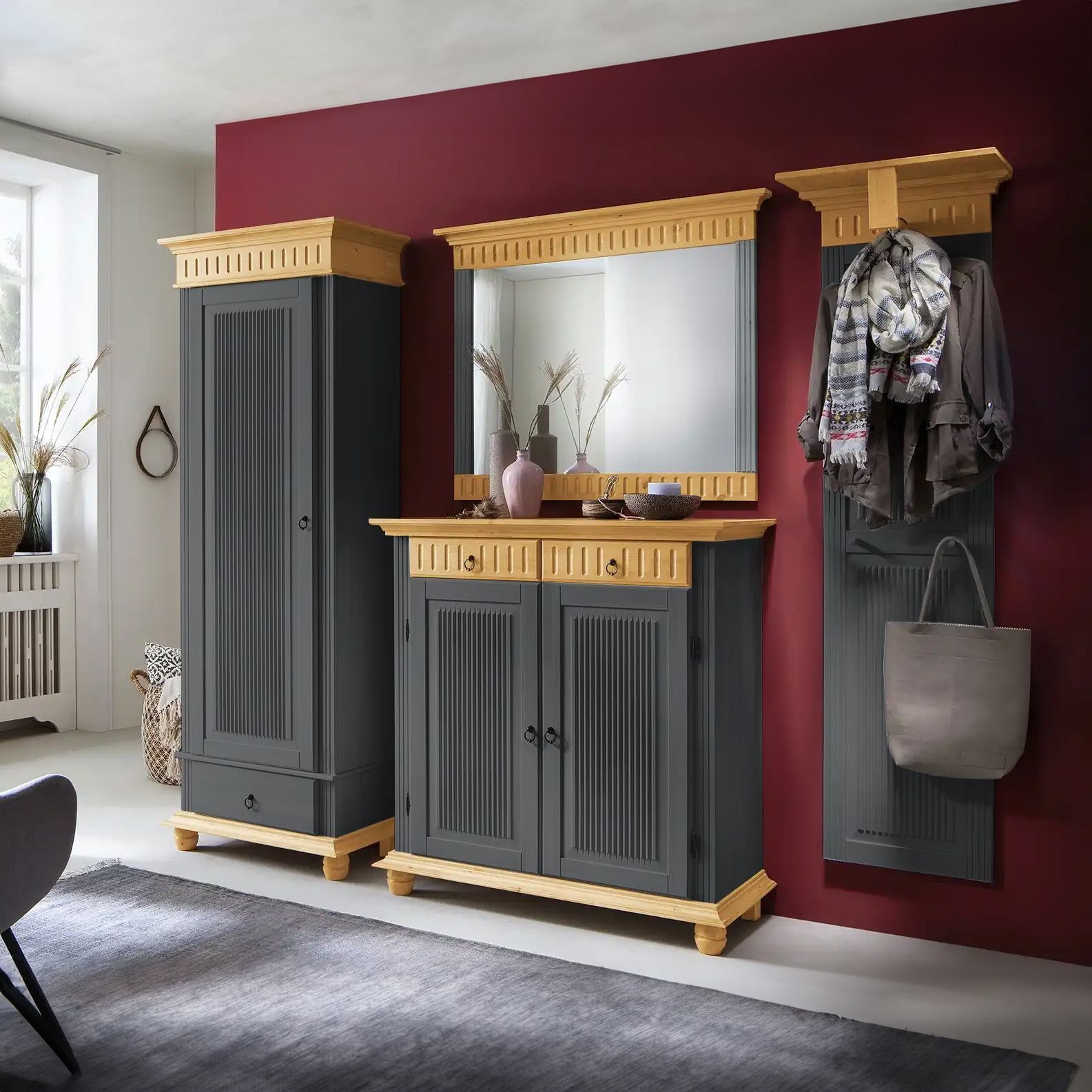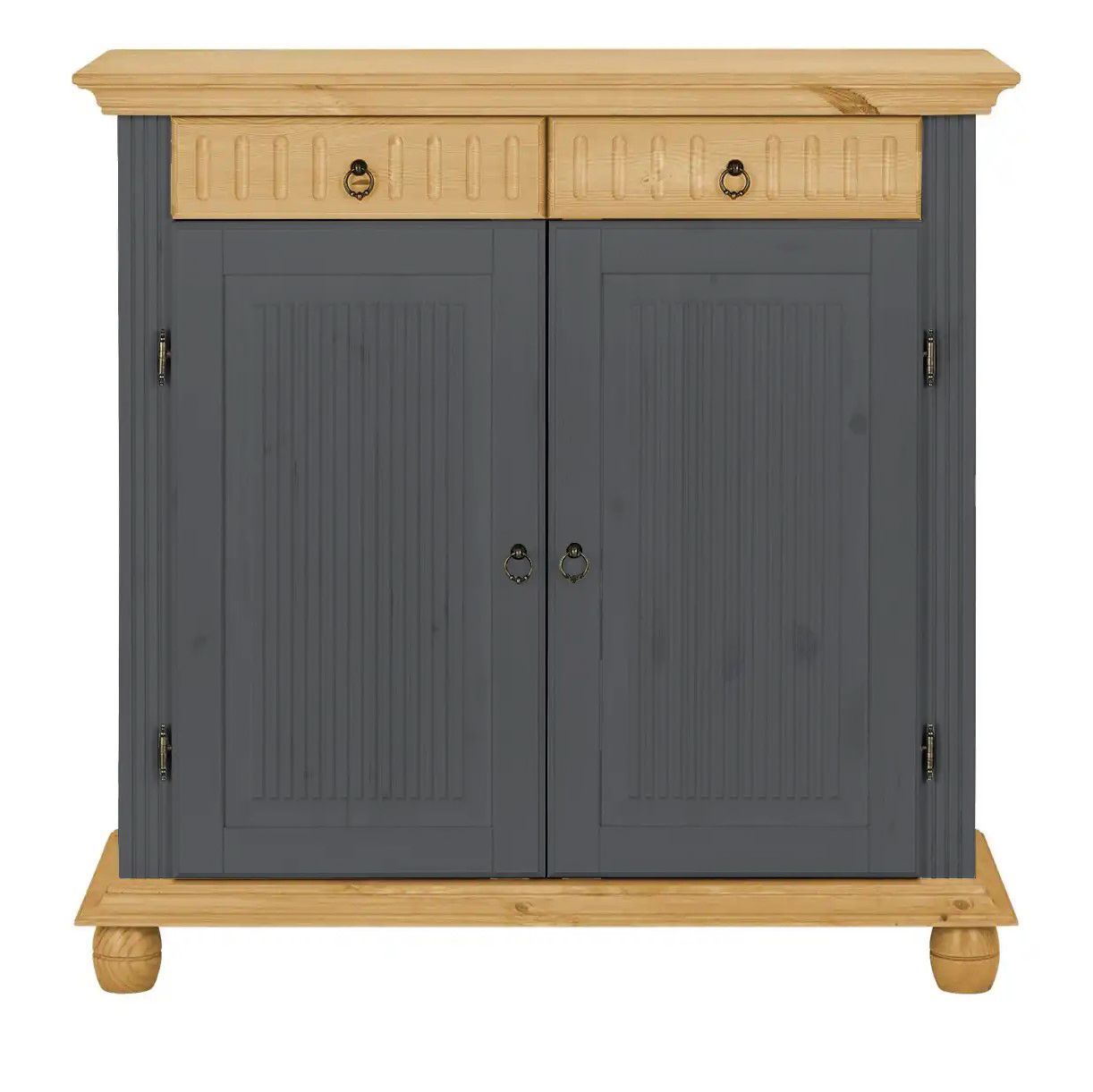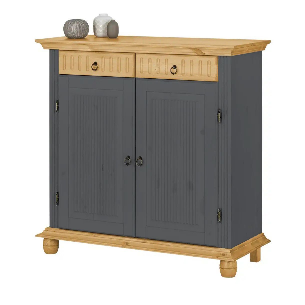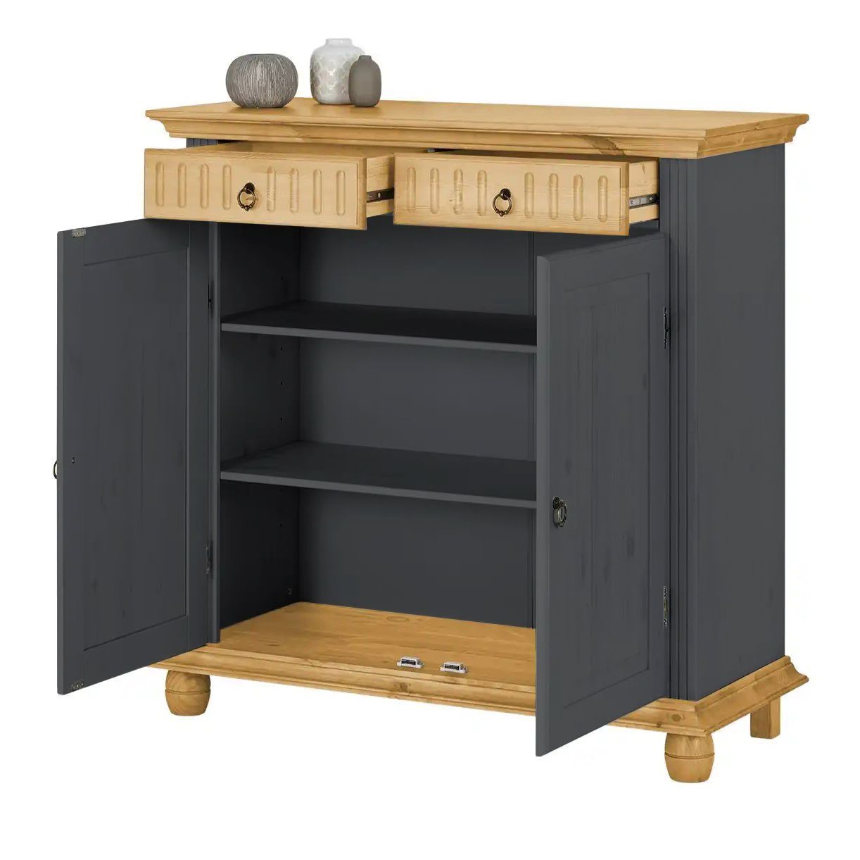 Обувница для прихожей оснащена двумя выдвижными ящиками на шариковых направляющих и двумя распашными дверцами, за которыми располагаются две полки для обуви, предназначенные для размещения до 12 пар обуви. Благодаря удобным мебельным металлическим ручкам Stavanger и уголку для крепления к стене, шкаф для обуви обеспечивает не только функциональность, но и безопасность. Его деревянные вставки в цвете антик, декоративная филенка и фрезеровка придают ему изысканный вид, который привлекает взгляд.