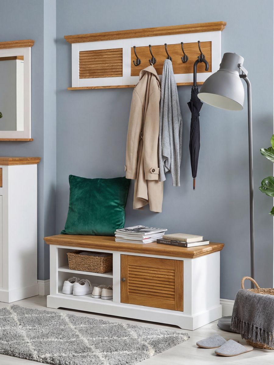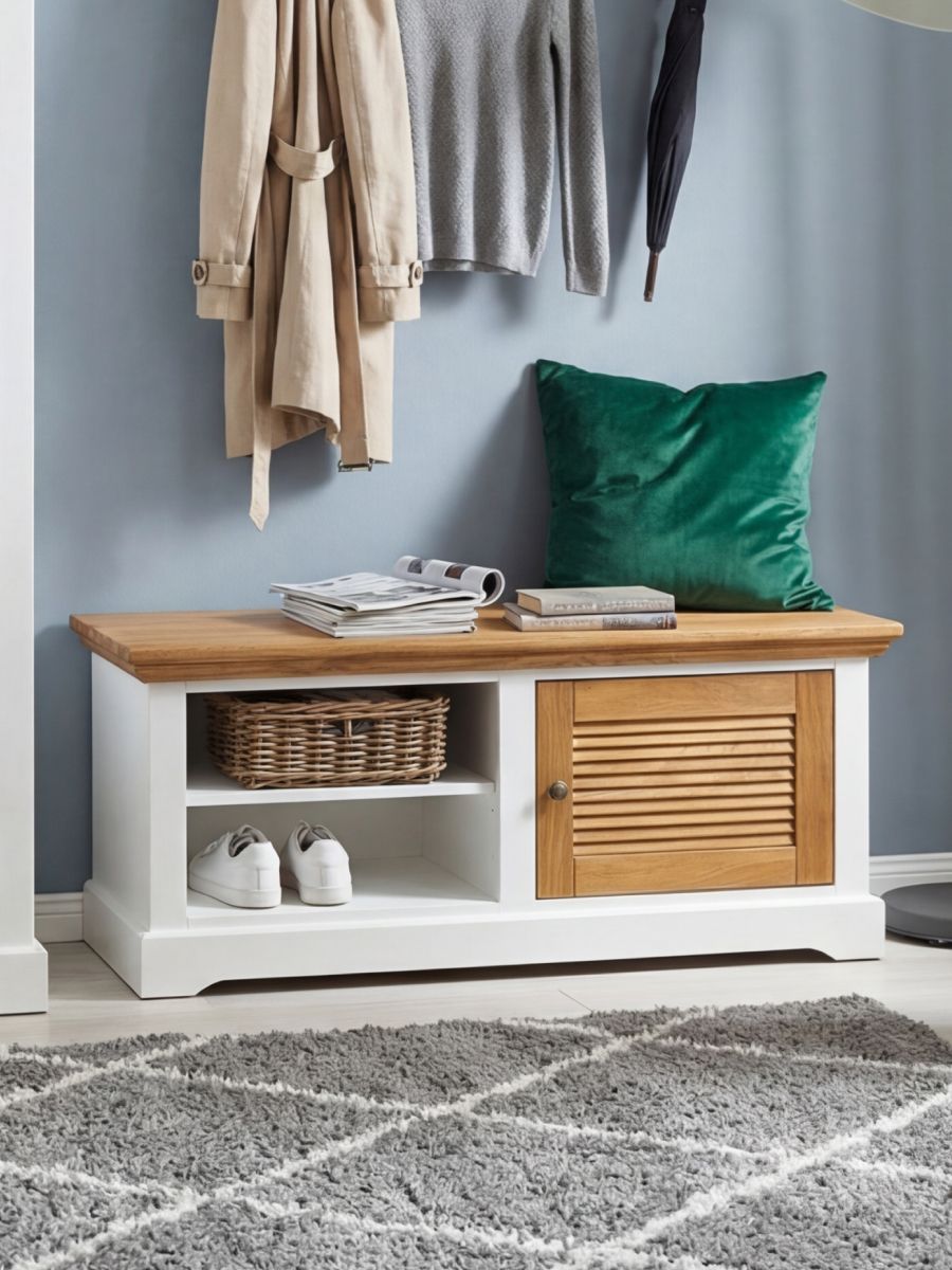 Добавьте элегантную и функциональную деталь в вашу прихожую с скамьей-комодом, выполненной из массива дуба и МДФ с белым покрытием. Идеальное решение для небольших пространств.