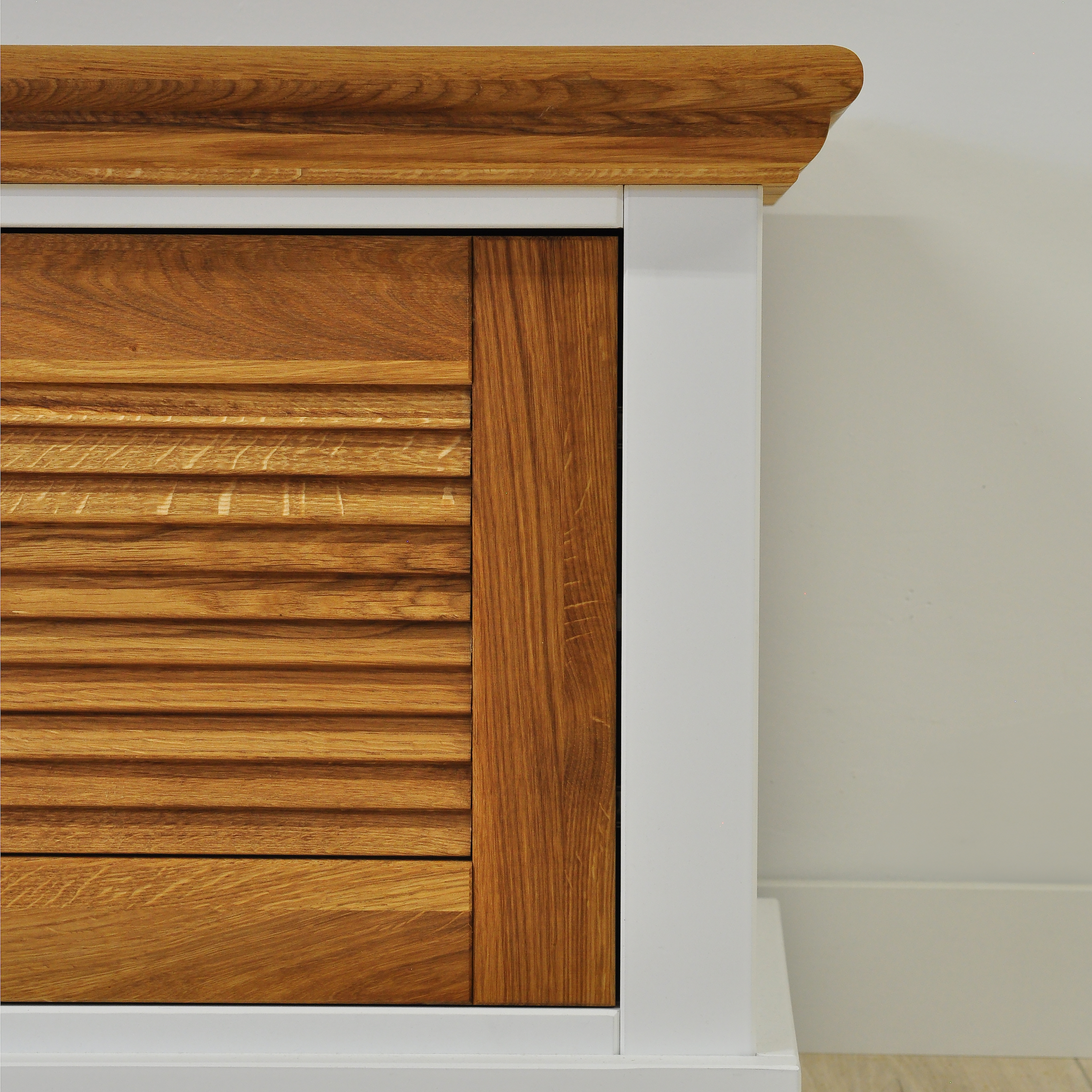Уникальные особенности: вставки натурального дуба в МДФ премиум качества, стильные металлические крючки. Потрясающий дизайн с фрезеровками на дубовых частях, смесь классического скандинавского стиля и модерна.