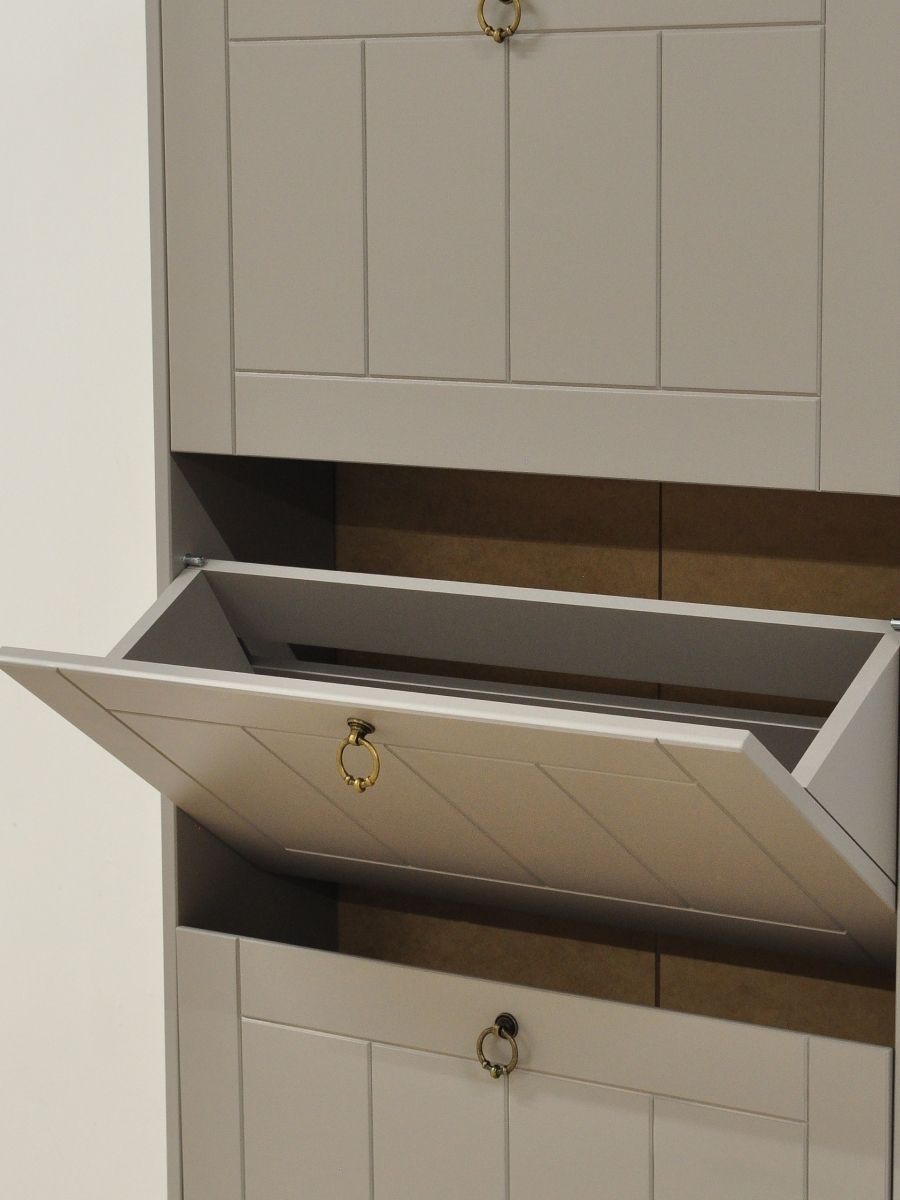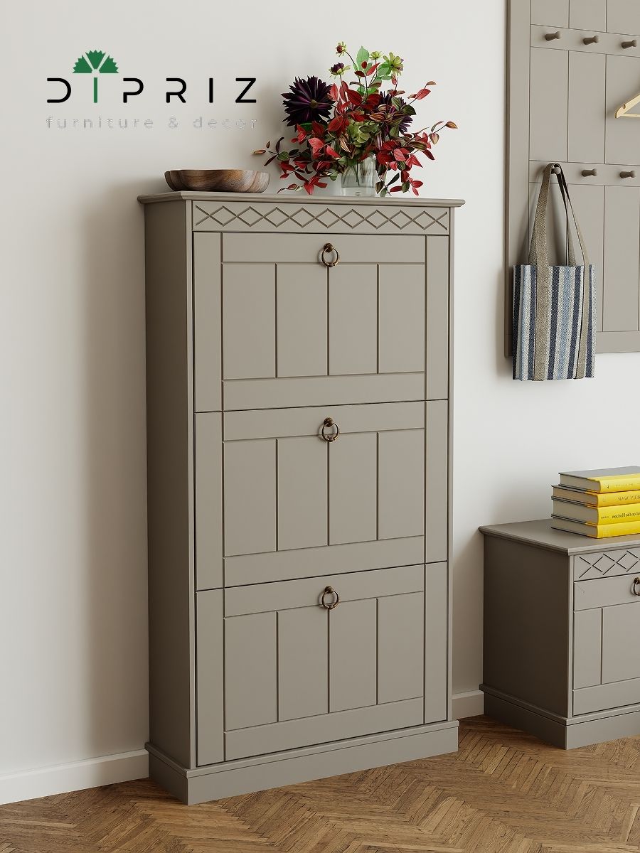 Обувница «Индра» — элегантное и функциональное решение для прихожей. Выполненная из качественного МДФ в сером цвете, она сочетает практичность и изысканный неоклассический стиль. Фасады украшены декоративной резьбой, придающей мебели благородный вид.