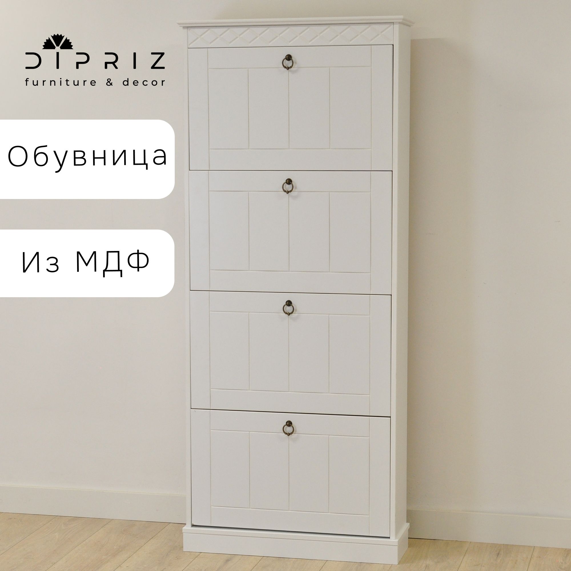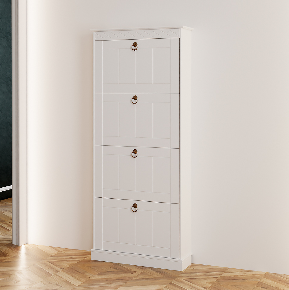 Обувница Индра - элегантное решение для вашей прихожей. Высокая тумба для обуви, выполненная из качественного МДФ в белом цвете, сочетает в себе практичность и изысканный неоклассический стиль. Фасады украшены утонченной декоративной резьбой, что придает мебели особый шарм и благородство. Идеально подходит для современных интерьеров, где ценится функциональность и эстетика.