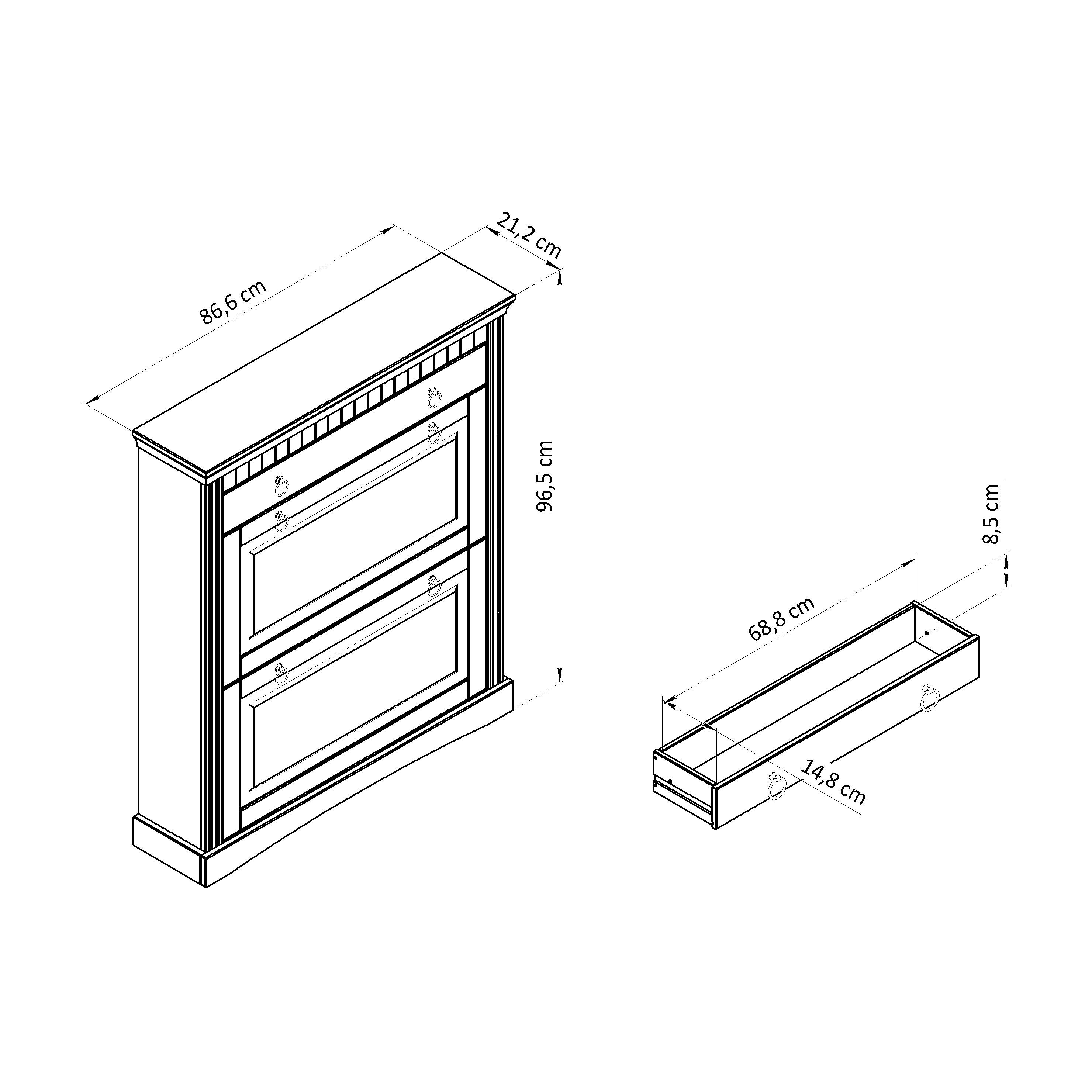 • Обувница по-настоящему прочная, что обеспечивается толщиной крышки и фасадов t=18 мм, фасада ящиков t=30 мм; толщина стенок, полика, стенок ящиков t=14 мм.