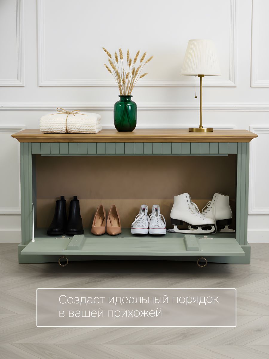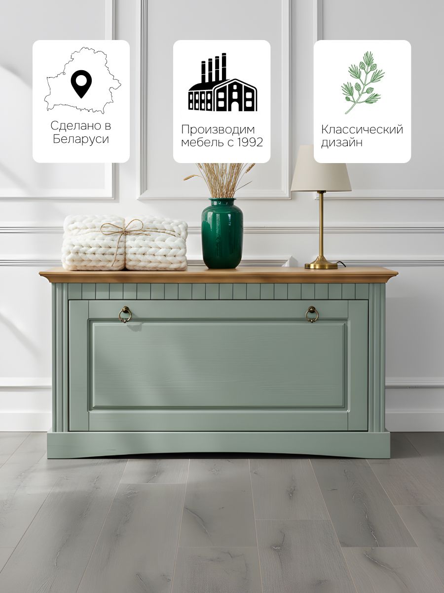 Выполненная из массива сосны, эта тумба для обуви не только предлагает удобное место для хранения обуви и других предметов, но и служит полноценным элементом интерьера прихожей. Благодаря эвкалиптовому цвету (за счет покрытия натуральным воском) обувница добавит элегантности и красоты Вашему помещению, сохранит приятный хвойный аромат и полезные свойства дерева. Это обеспечивает не только стойкость к внешним воздействиям, но и подчеркивает естественную красоту массива дерева. Фасад комода для обуви дополнен декоративными резными вставками, которые добавит изысканности в ваше помещение.