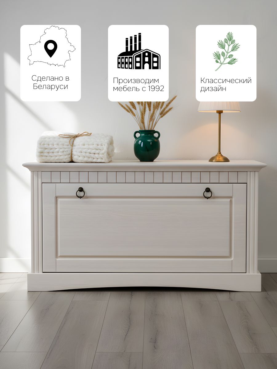 Банкетка обувница Неаполь станет незаменимым помощником в вашем доме, объединяя в себе функции хранения и комфортного использования. Скамья для обуви в прихожую идеально вписывается в различные стили интерьера, включая классический, современную классику, викторианский, минимализм и модерн. Изделие также прекрасно подойдет для создания уютного светлого помещения, его можно использовать как тумбу для обуви, комод для прихожей, банкетку, обувницу с сиденьем, обеспечивая функциональность и эстетику. Комбинируйте ее с другими элементами интерьера серии Сюзанна, создавая уютное и стильное пространство.