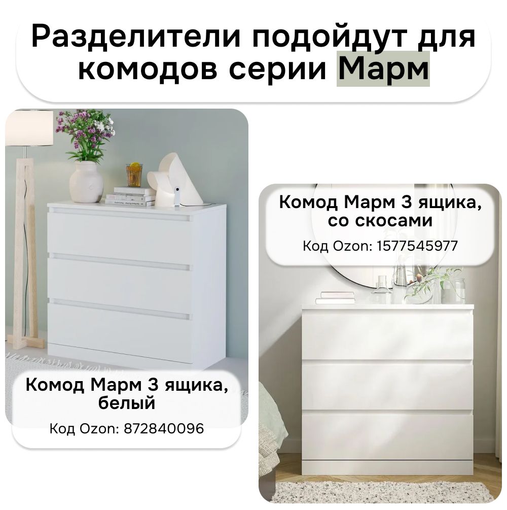 Артикулы/SKU наших комодов (можно найти введя в строку поиска Ozon), для которых идеально подойдут представленные разделители: 1577545977, 872840095, 872840096, 1561778447, 1577547179.