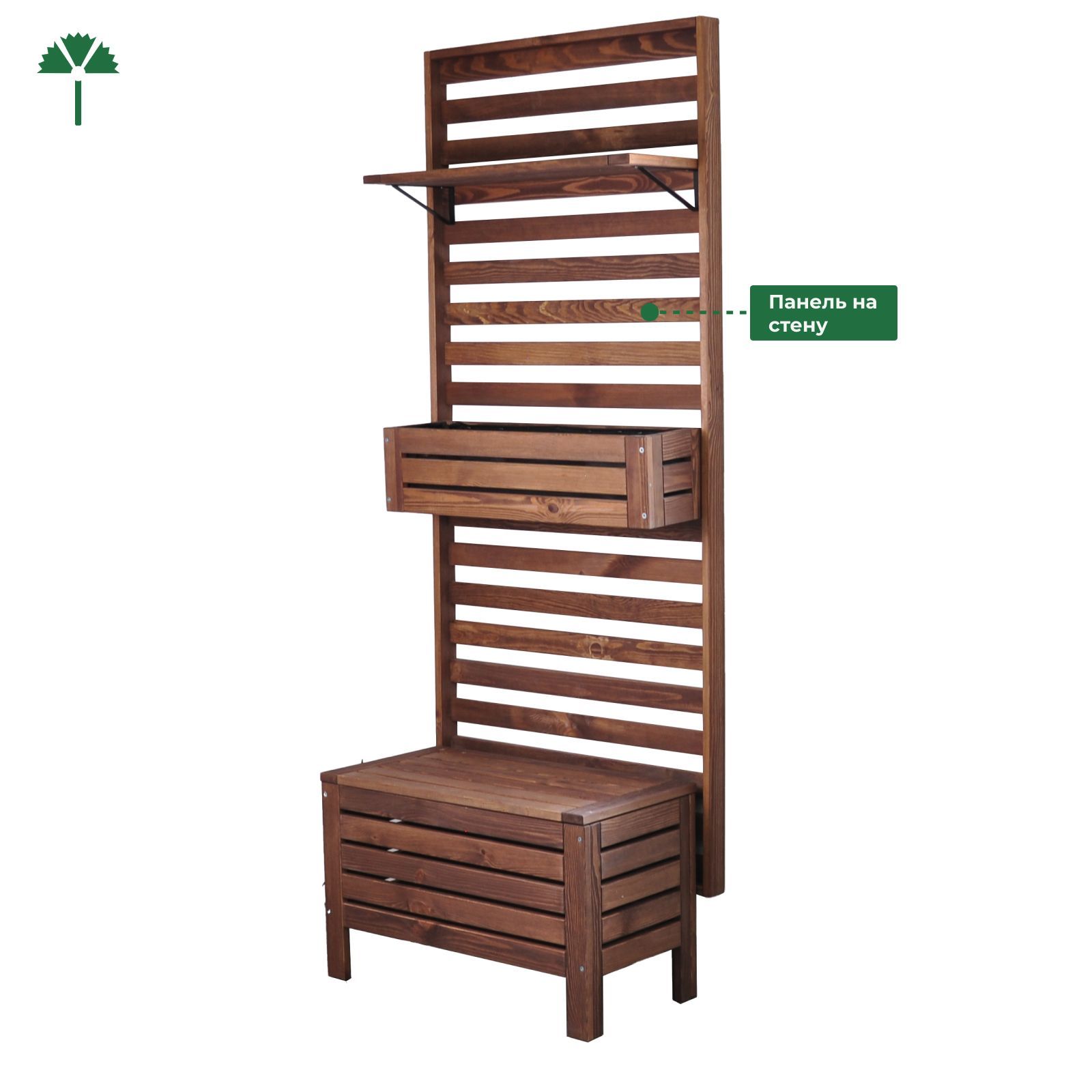 Навесная панель Эпларо - стильное дополнение к модульной садовой мебели, изготовленное из массива сосны и легко крепящееся к стене с помощью в комплекте идущей фурнитуры. Уникальность этой панели заключается в том, что вы сами определяете, какие элементы серии разместить на ней, делая ее настоящим организатором пространства.