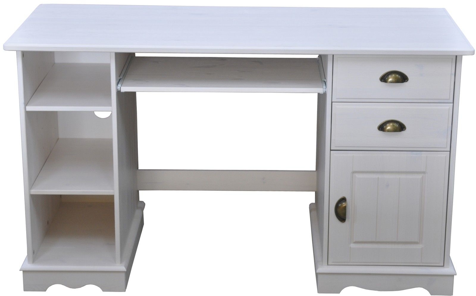 Стол письменный Клаудиа изготовлен из массива сосны, от белорусского производителя мебели "Диприз", с использованием экологически чистых отделочных материалов. Стол обладает лаконичным дизайном, поэтому идеально впишется в любую комнату дома, квартиры или офисного помещения. Он выдержан в сдержанных тонах и имеет экстравагантные металлические ручки в виде ракушек. Благодаря своему дизайну стол подходит для различных стилей помещений. Данная модель рабочего стола совмещает 2 ящика, 2 полки, дверцу и также выдвижную полочку для клавиатуры. Чтобы аккуратно хранить ваши офисные принадлежности, он оснащен просторными ящиками и функциональными полками. Стол письменный станет прекрасным помощником в организации рабочего места.