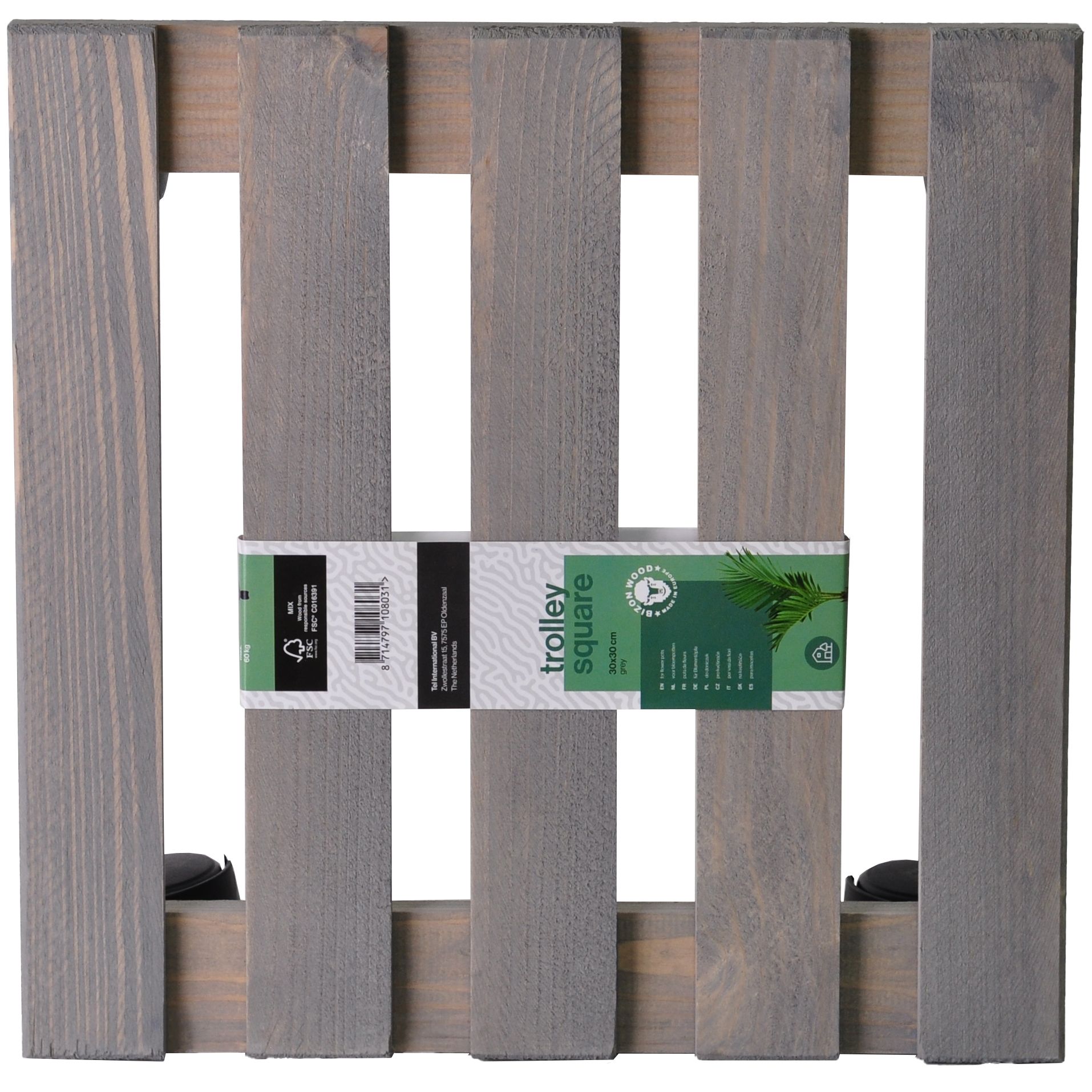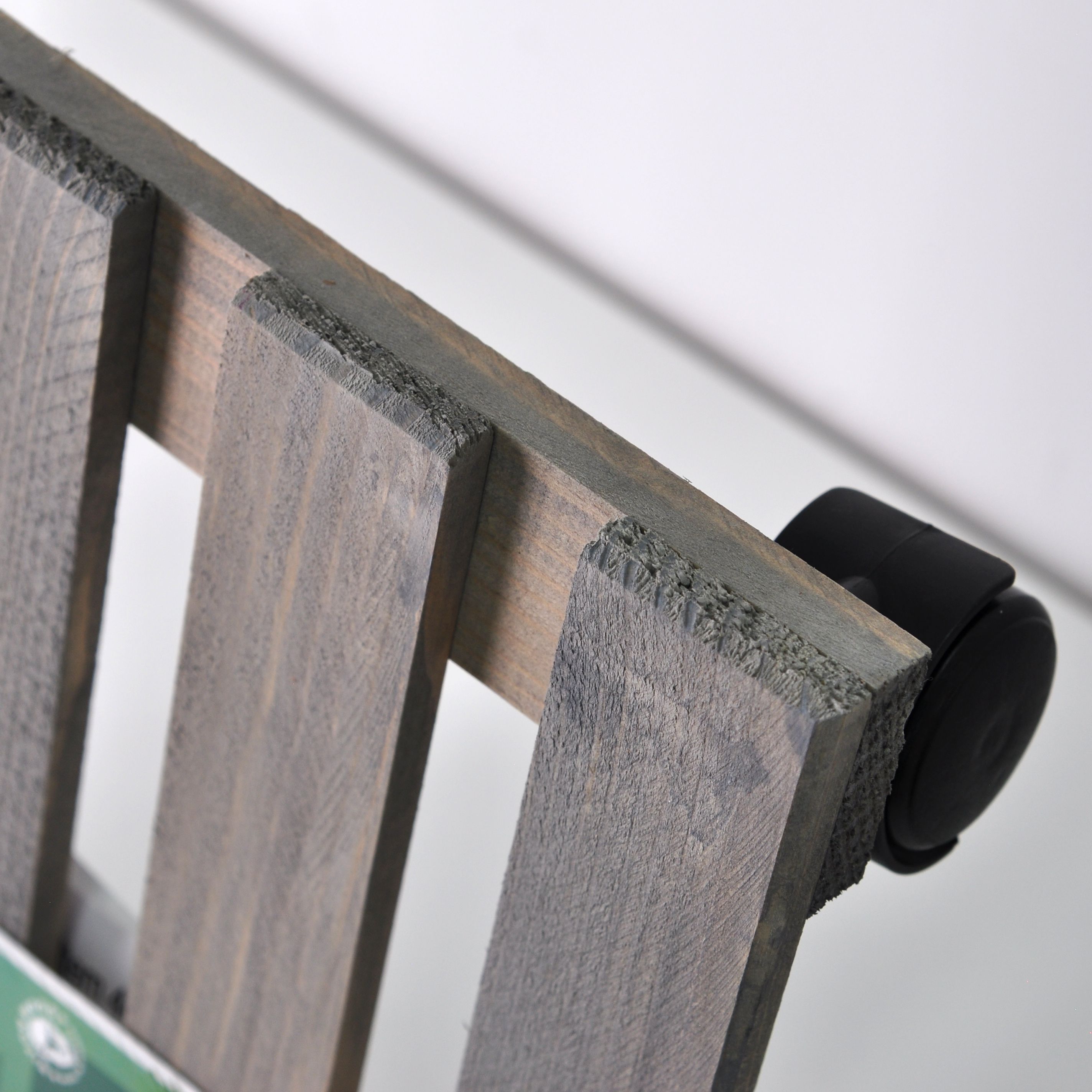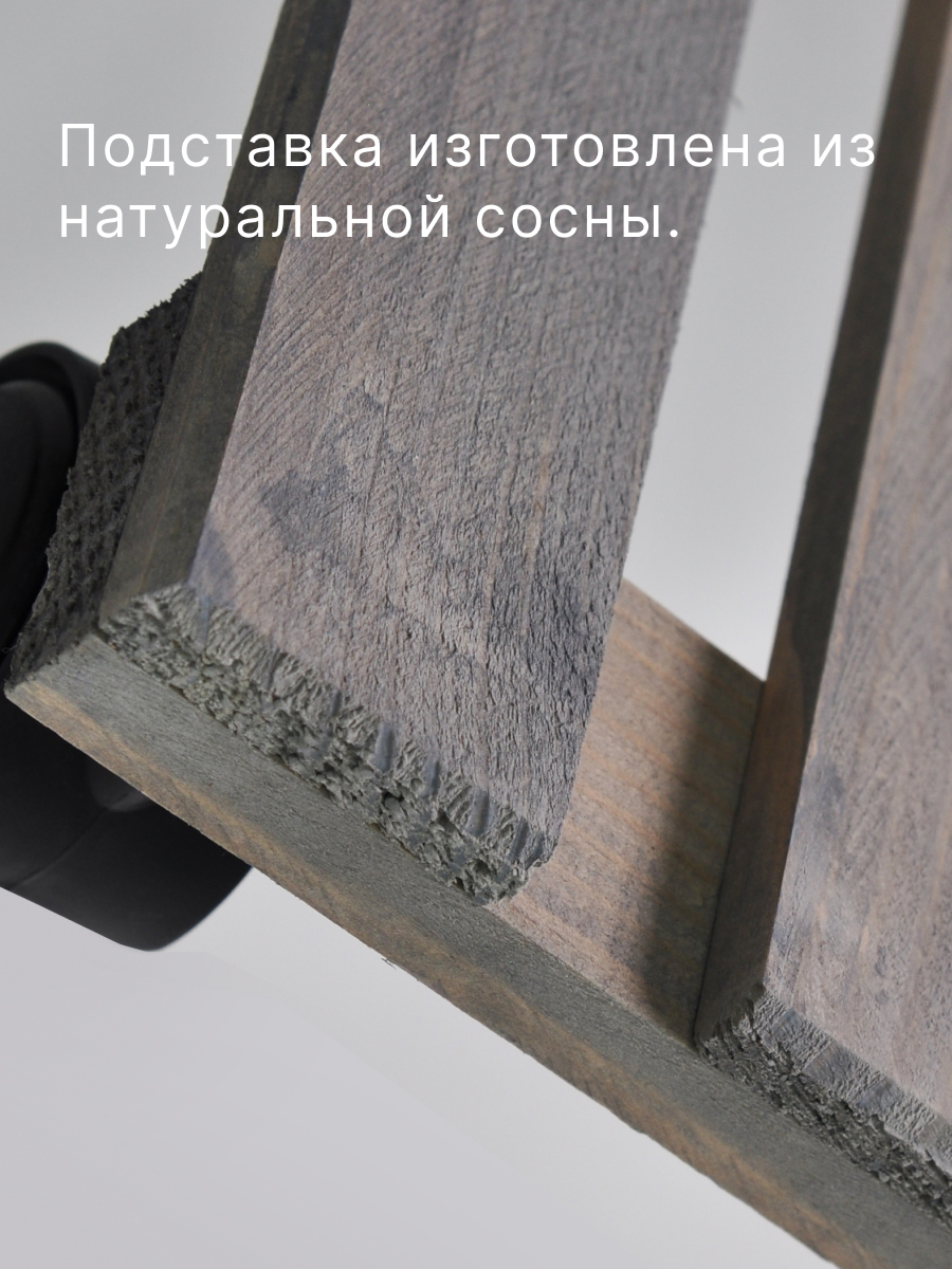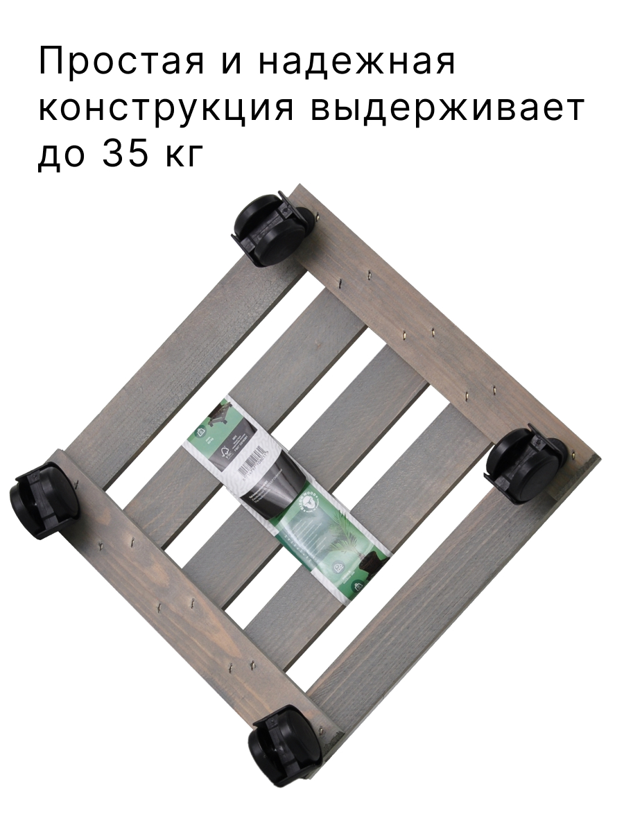 Особенностью подставки является грубоватое, почти нешлифованное покрытие из натурального дерева (массива сосны) в форме квадрата в брутальном деревенском стиле рустик (состаренная европейская фактура). Преимущество подставки для цветов на колесиках состоит в том, что она покрыта натуральным серым бейцем на водной основе. Это не только защищает дерево от влаги, солнечных лучей и грибковых поражений, но и подчеркивает его натуральную красоту и текстуру, что добавляет теплоты и естественности в интерьер вашего помещения.