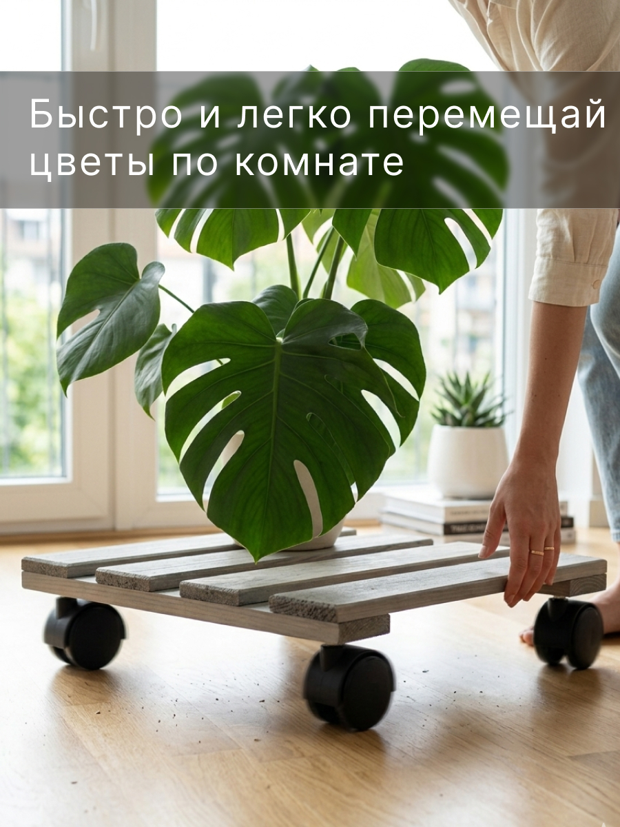 Особое преимущество деревянной напольной подставки заключается в том, что она может использоваться не только для размещения цветов, но и для других предметов, которые трудно перемещать вручную. Изделие обеспечивает прочную и надежную опору, позволяя легко передвигать тяжелые предметы без риска повреждения пола или других поверхностей, что особенно полезно в офисных помещениях или других местах с частыми перемещениями. Например, она может использоваться как горшок для цветов, ваза для цветов или подставка под кулер для воды, который как правило достаточно тяжелый для подъема и перемещения.