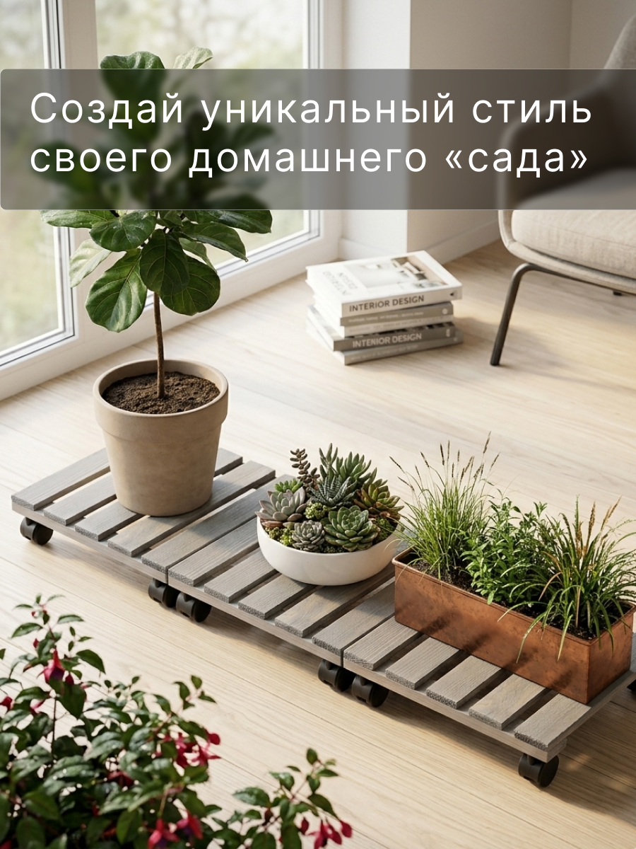 Подставка для цветов напольная на колесиках обеспечивает легкую и удобную транспортировку, позволяя без труда перемещать цветы из одной части комнаты в другую и наслаждаться их красотой из любой точки. Длина и ширина подставки составляет 30 см, высота 7 см. Максимальная допустимая нагрузка на подставку составляет 60 кг. Ее размер и конструкция идеально подойдут для различных типов цветов и комнатных растений, а крепкая конструкция обеспечивает стабильность и надежность использования.