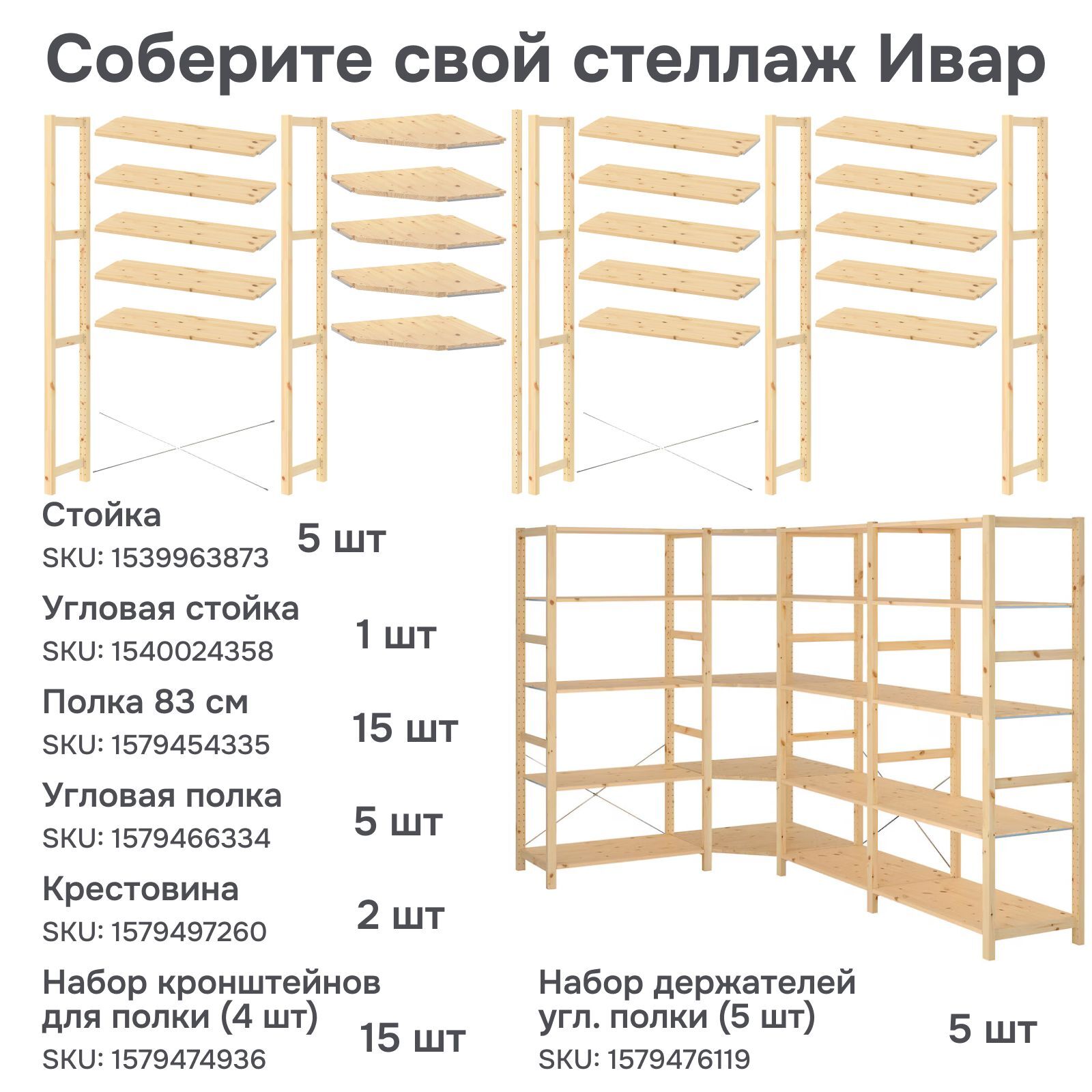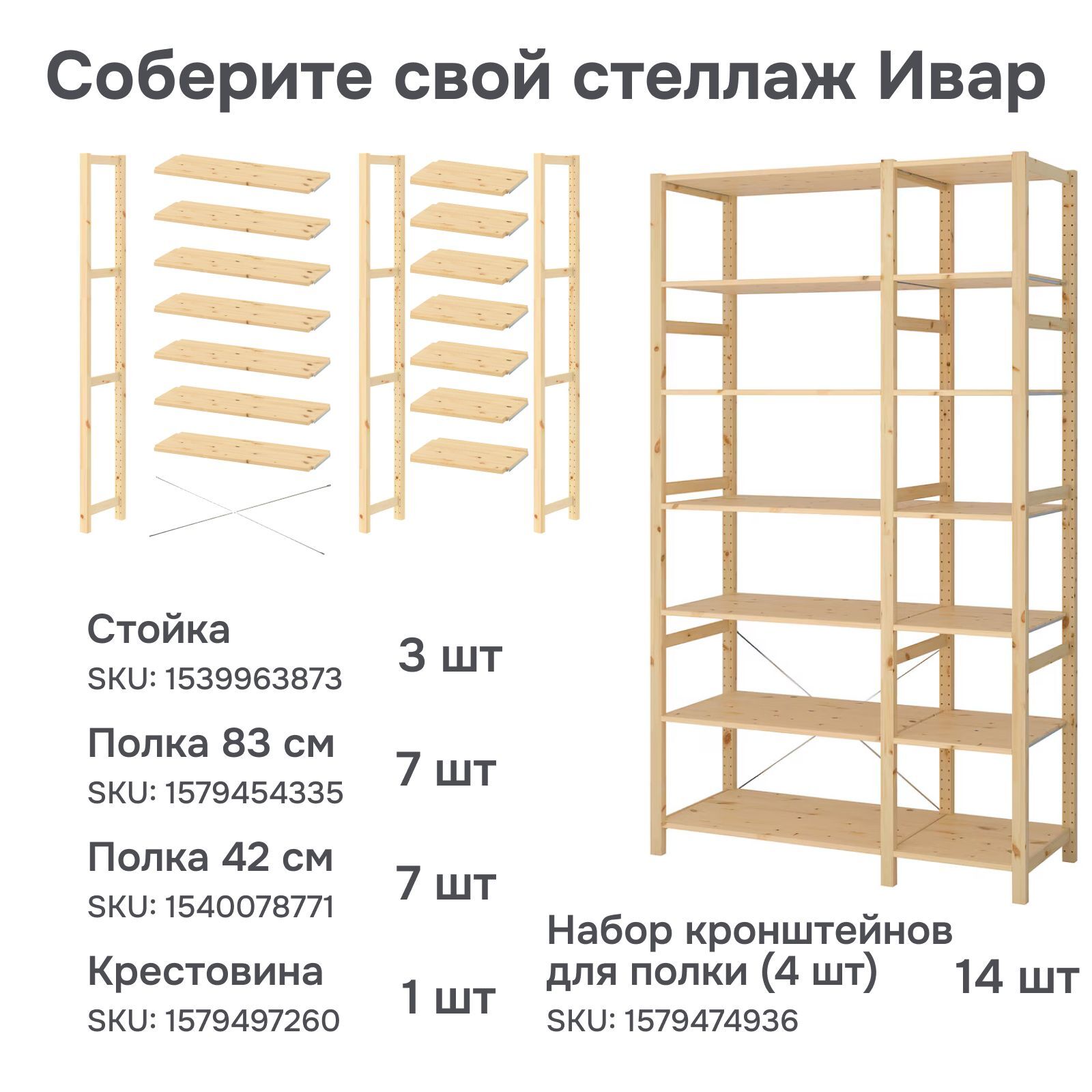 Главной особенностью серии Ивар является возможность создания уникальных комбинаций из большого множества доступных деталей для создания вариантов мебели, которые подойдут именно Вам. Благодаря возможности отдельного приобретения частей серии Ивар, Вы сможете максимально эффективно организовать пространство для хранения в любом помещении: от просторной кухни и прихожей до небольшой кладовой и дачного уголка. Полка для стеллажа Ивар 42x30 см изготовлена из экологически чистого материала - массива сосны и выполнена без отделки. Это долговечный натуральный материал, который можно красить, смазывать маслом или окрашивать в зависимости от предпочтений. Массив сосны - это натуральный материал, который прекрасно стареет и со временем приобретает свой уникальный оттенок. В наличии нашего ассортимента также имеются боковые стойки 179 см (SKU: 1539963873) и полки размерами 42х30 (SKU: 1540078771) и 83х30 см (SKU: 1579454335), которые созданы специально для создания множества комбинаций. Они отлично подойдут для самостоятельной сборки готового стеллажа с индивидуальными размерами под Ваши потребности. Крепление полок к стойке для стеллажа осуществляется с помощью кронштейнов и шурупов. Для крепления данной полки (в количестве 1 полки) с 2 боковыми стойками для стеллажа Вам понадобится комплект из 4 кронштейнов и шурупы для фиксации. Комплекты из 4 шт. (SKU: 1579474936) и 5 шт. (SKU: 1579476119) доступны для приобретения в нашем каталоге. Дополнительно Вы можете приобрести угловую стойку (SKU: 1540024358) и угловые полки (SKU: 1579466334) для сборки углового стеллажа. Для создания углового стеллажа Вам потребуется 2 боковые стойки, 1 угловая стойка и комплект из 5 кронштейнов из расчета на 1 полку. Простота сборки - одно из главных преимуществ приобретения нашей мебели. Наличие подробной проиллюстрированной инструкции и полного комплекта фурнитуры позволит собрать готовую мебель так же легко, как конструктор, сэкономив массу времени и сил. Полка поставляется в полностью собранном виде со сверлениями для крепления к стойке и созданию стеллажа с собственным наполнением. Для большей прочности добавьте поперечную скобу-крестовину Ивар (SKU: 1579497260) на каждую вторую секцию при сборке стеллажа (приобретается отдельно). Сочетание различных комбинаций позволит собрать собственную мебель, будь то угловой стеллаж для книг или напольный стеллаж в гараж. Габариты данной полки (Ширина х Глубина х Высота, см) - 42х30х1.8 см. Максимальная допустимая нагрузка на полку составляет до 5 кг. Рекомендуется протирать материалы сухой тканью. Пятна с дерева можно удалить с помощью ластика или мелкой наждачной бумаги. Для большей устойчивости эта мебель должна быть прикреплена к стене с помощью комплекта фурнитуры, который идет в комплекте.