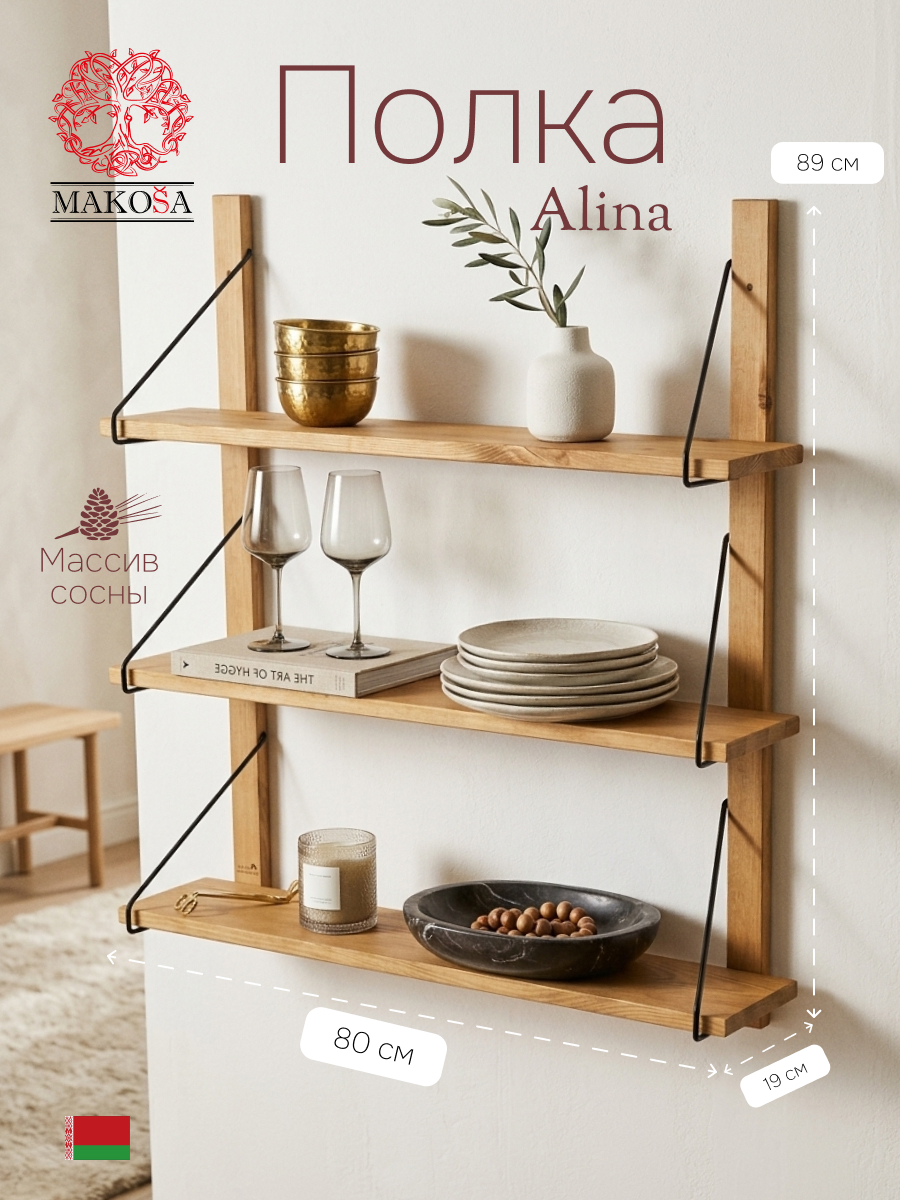 Настенная полка «Алина» (80х19х89 см) от MAKOSA — инвестиция в здоровье и уют вашего дома. Произведено крупнейшей белорусской фабрикой ООО «Диприз» (с 1992 года), где мебель создают не на конвейере, а как произведение искусства, способное выдерживать десятилетия.