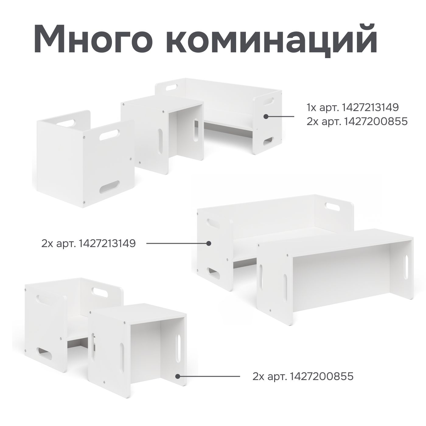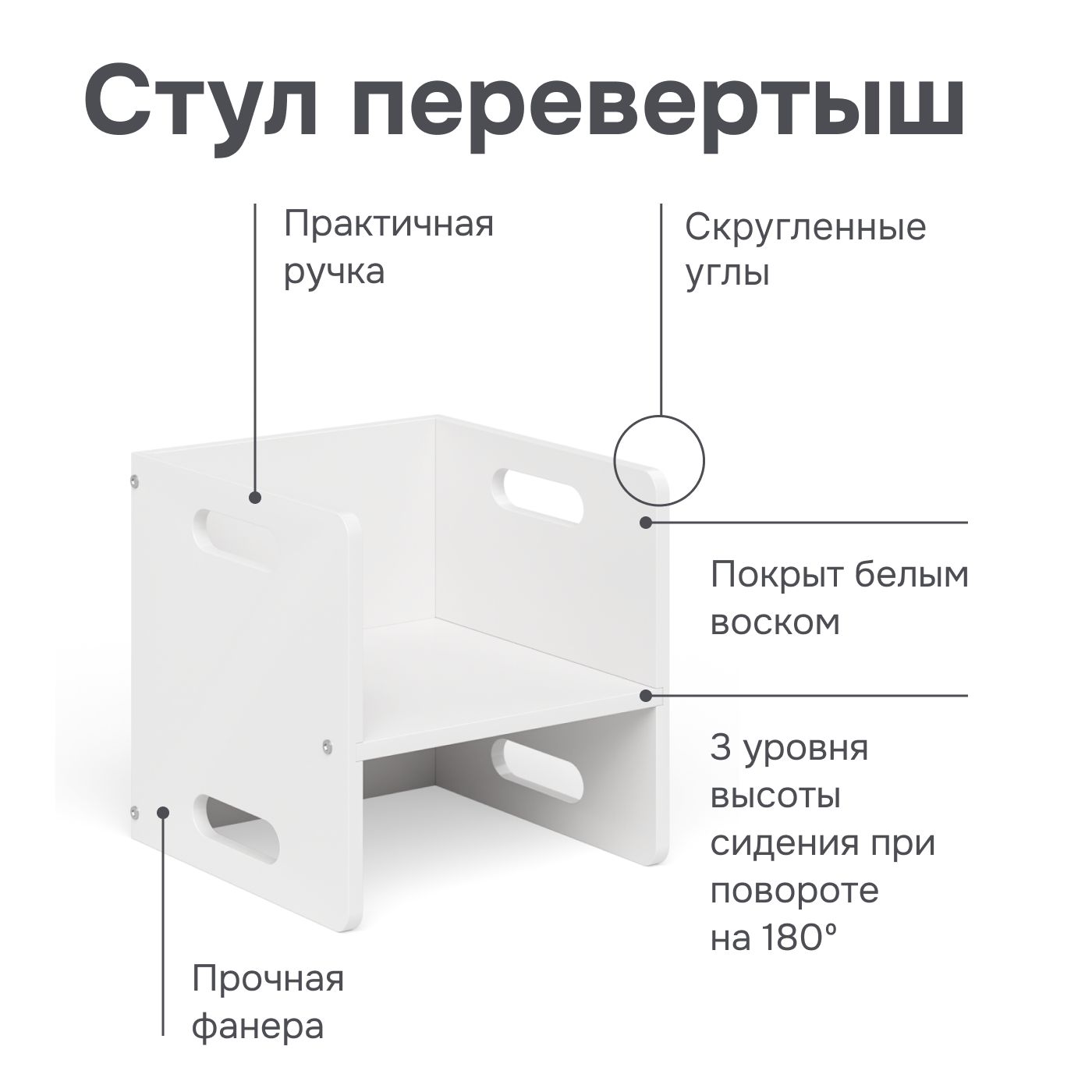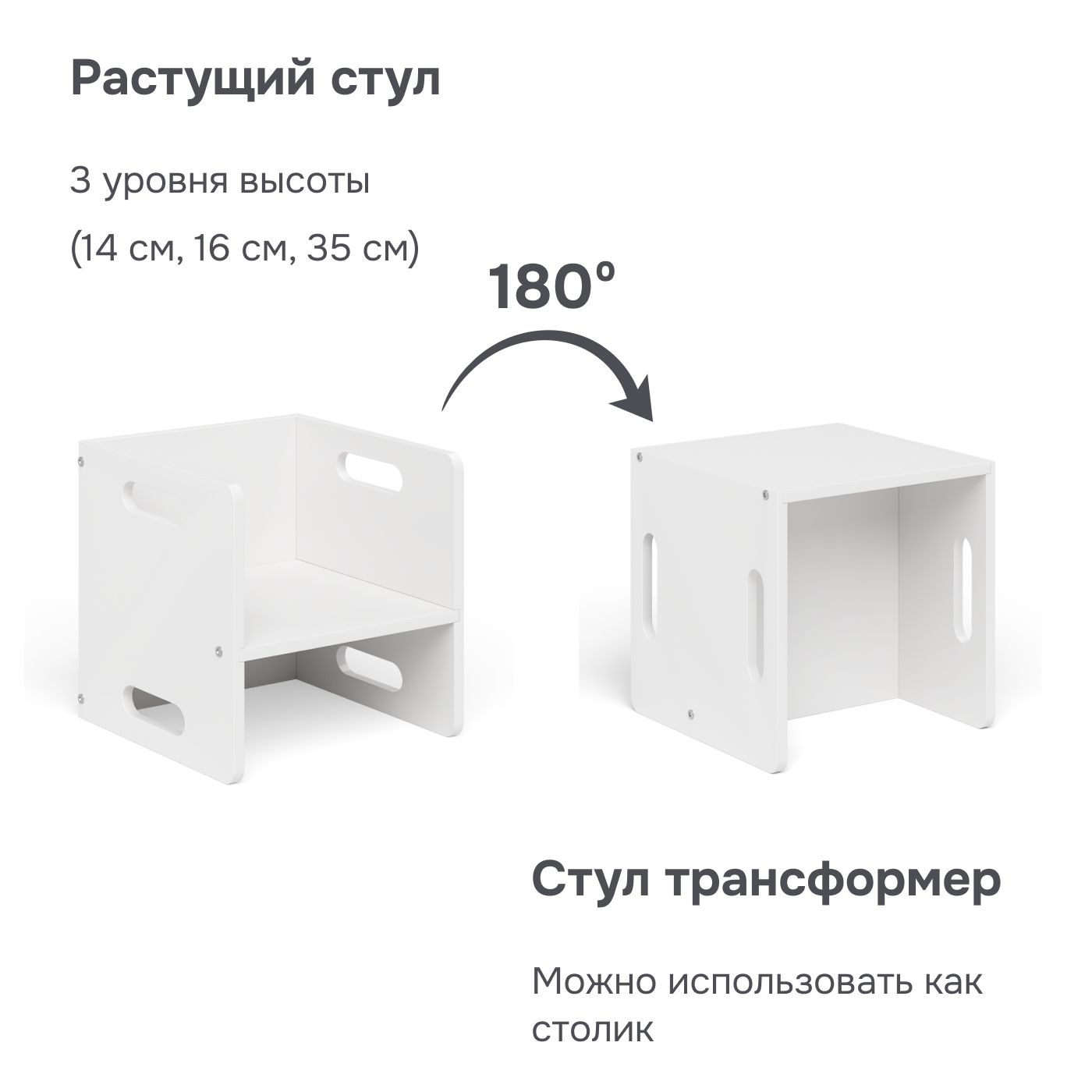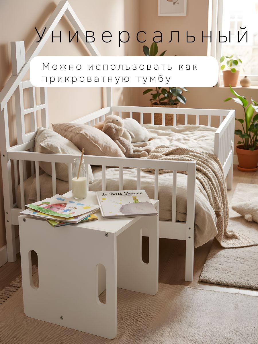 Благодаря возможности установки в 3 положениях, этот столик может быть использован как детский стол, растущий стул для детей и даже скамья для обуви. Все это в одном компактном изделии! Также вы можете дополнительно приобрести больший вариант детского стола перевертыша, тем самым собрав стильный набор детский стол и стул.