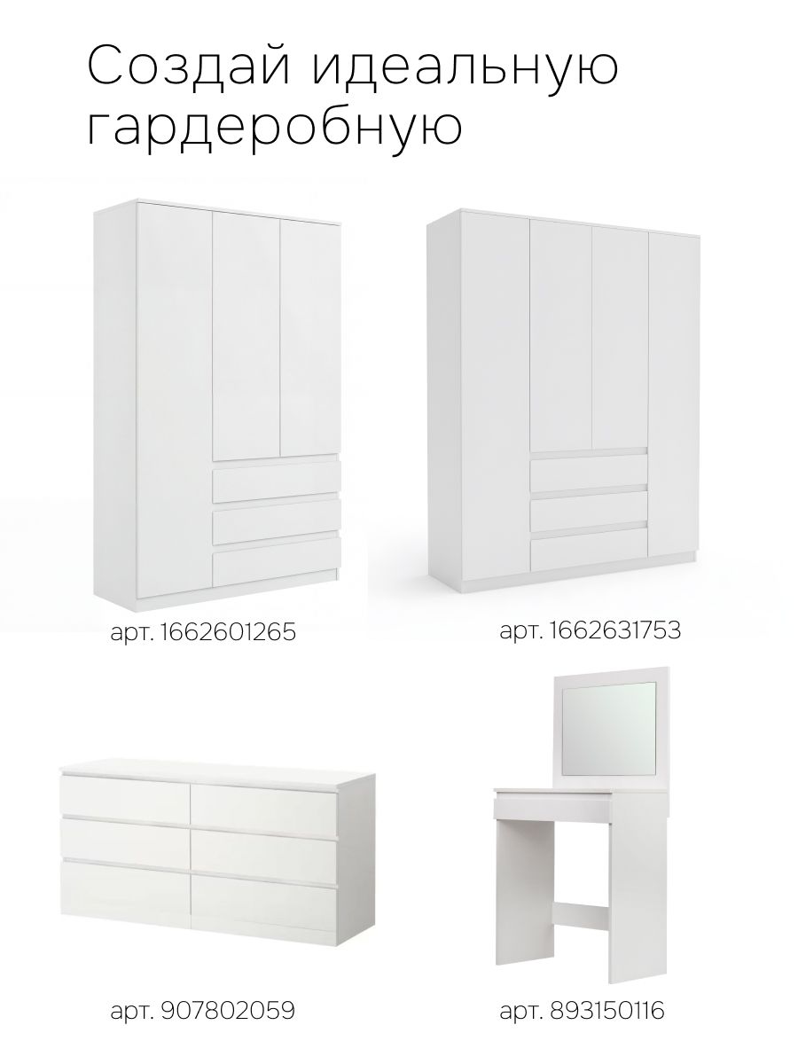 Конструкция шкафа включает в себя 3 съемные и 2 стационарные полки, 3 выдвижных ящика (шариковые направляющие), металлическую штангу для одежды и 3 распашные двери со скрытыми ручками. Внутреннее пространство белого шкафа можно использовать для хранения вещей одного типа или тематически по назначению. Например, верхние полки использовать под футболки и майки, нижние полки и ящики - под носки, перчатки и шарфы, пижамы и домашнюю одежду. Благодаря шариковым направляющим в комплекте, ящики шкафа будут плавно выдвигаться и тихо закрываться, они более надежны и долговечны.