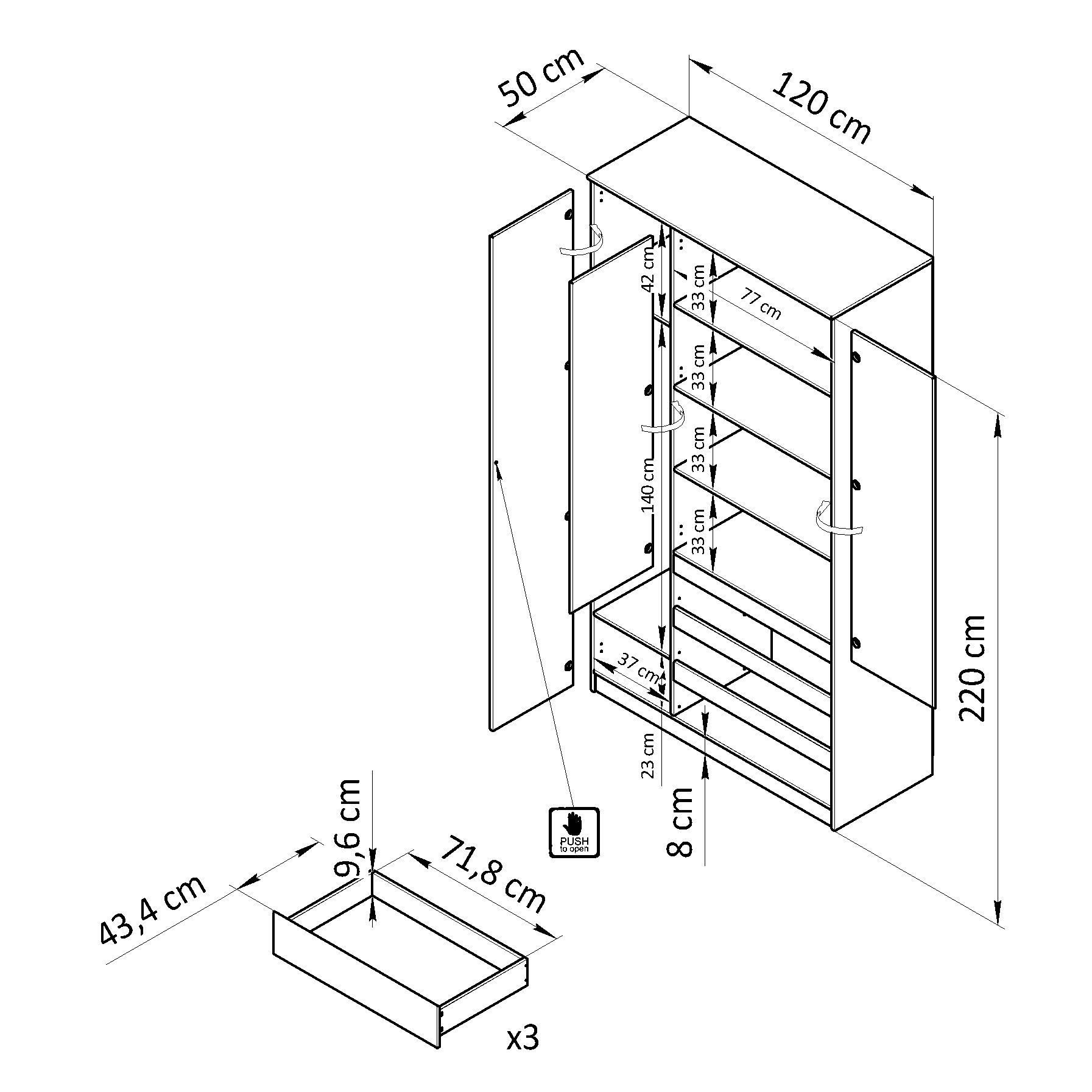 Размеры шкафа в собранном виде (Ширина х Высота х Глубина, см): 121х51х208 см, что позволит удобно хранить как домашнюю одежду и текстиль, так и верхнюю одежду с обувью, не беспокоясь о порядке. Особенностью изделия являются распашные двери и ящики без видимых ручек, которые открываются легким движением руки. Полки с регулировкой высоты в 3 положениях позволят использовать внутренне пространство шкафа по Вашему желанию, а максимальная допустимая нагрузка на полку составляет 5 кг.
