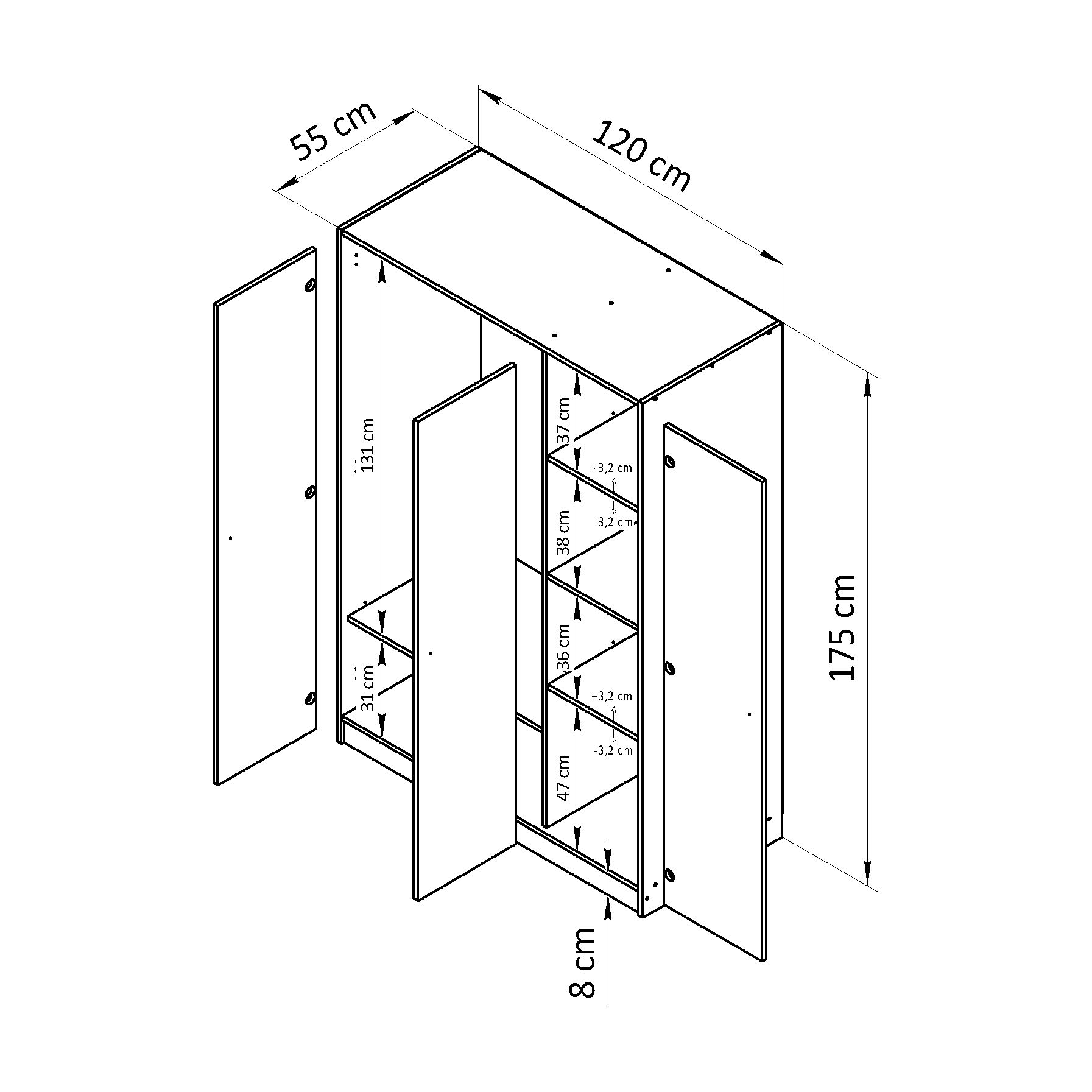 Размеры шкафа в собранном виде (Высота х Ширина х Глубина, см): 120х55х175 см, максимальная допустимая нагрузка на полки составляет до 10 кг. Допустимо крепление шкафа к стене при помощи уголка для большей устойчивости (поставляется в комплекте).