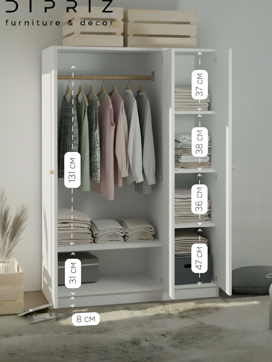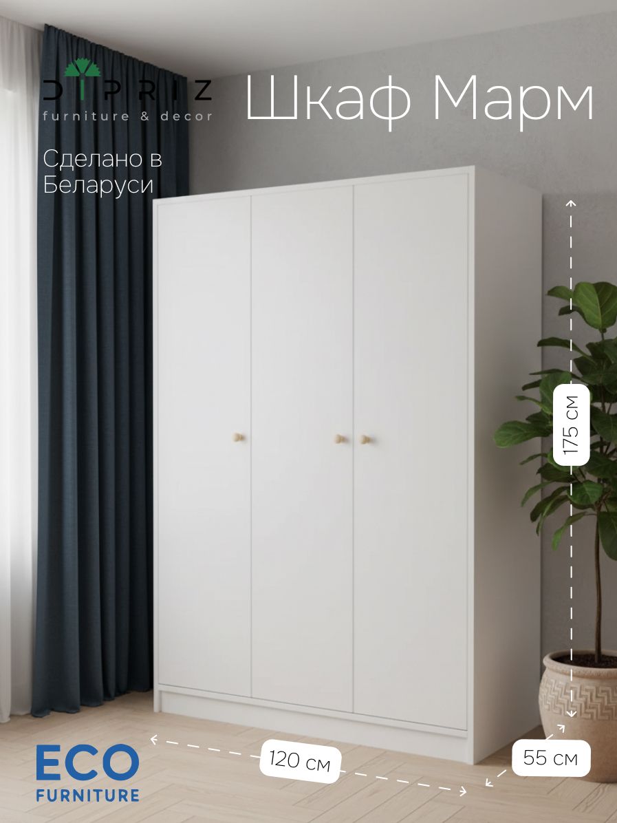 Распашной белый шкаф для одежды Марм 120х55х175 см – отличное дополнение скандинавского интерьера. Трехдверный шкаф со штангой и вместительными полками создаст порядок в любой комнате, будь то прихожая, спальня, гостиная, ванная или детская комната.